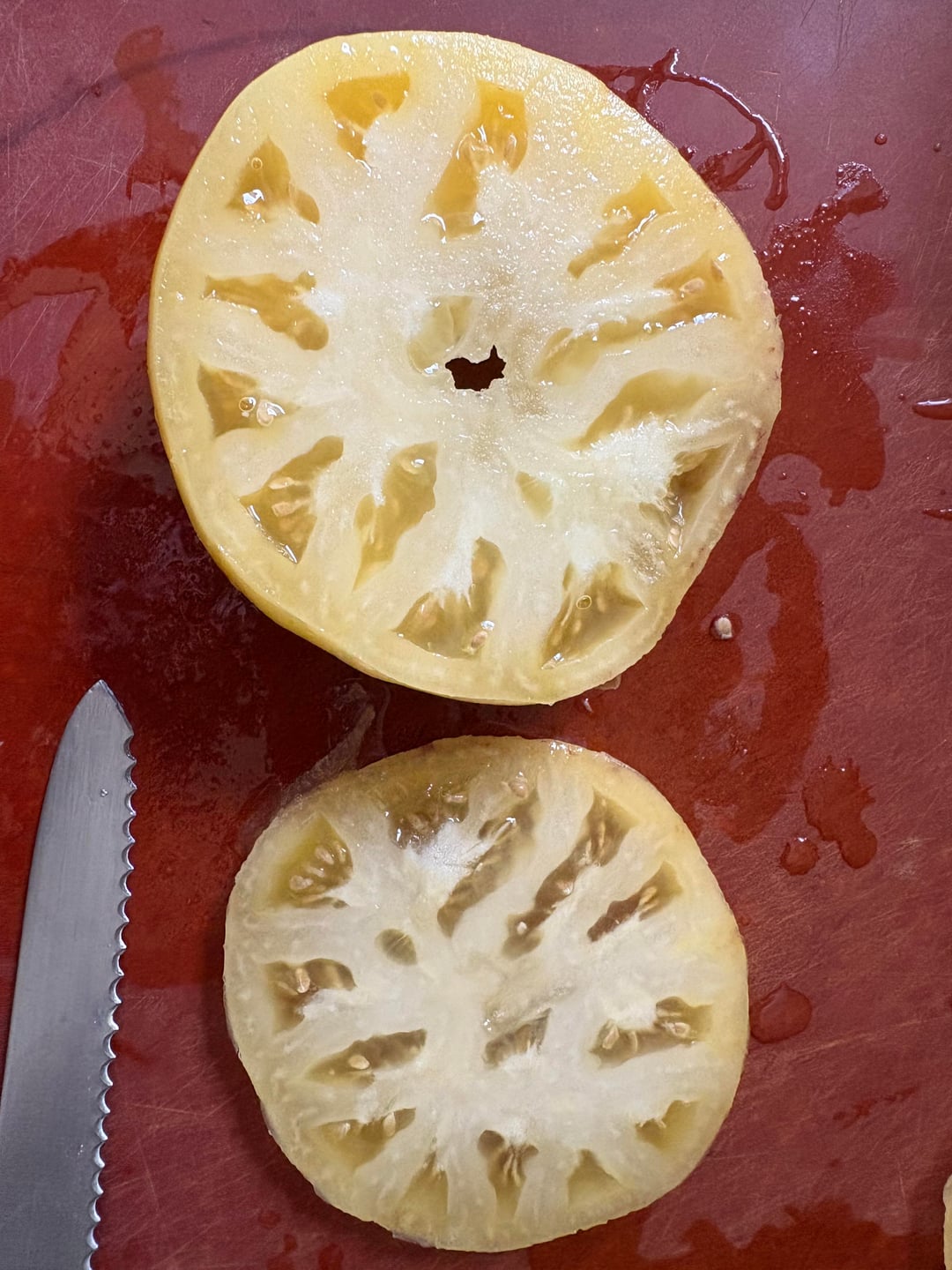 Lovely! We are finally getting some ripe orange moon glow ones in, and we have Cherokee purple heirlooms that look just like yours! Tasty very sweet not acidic at all