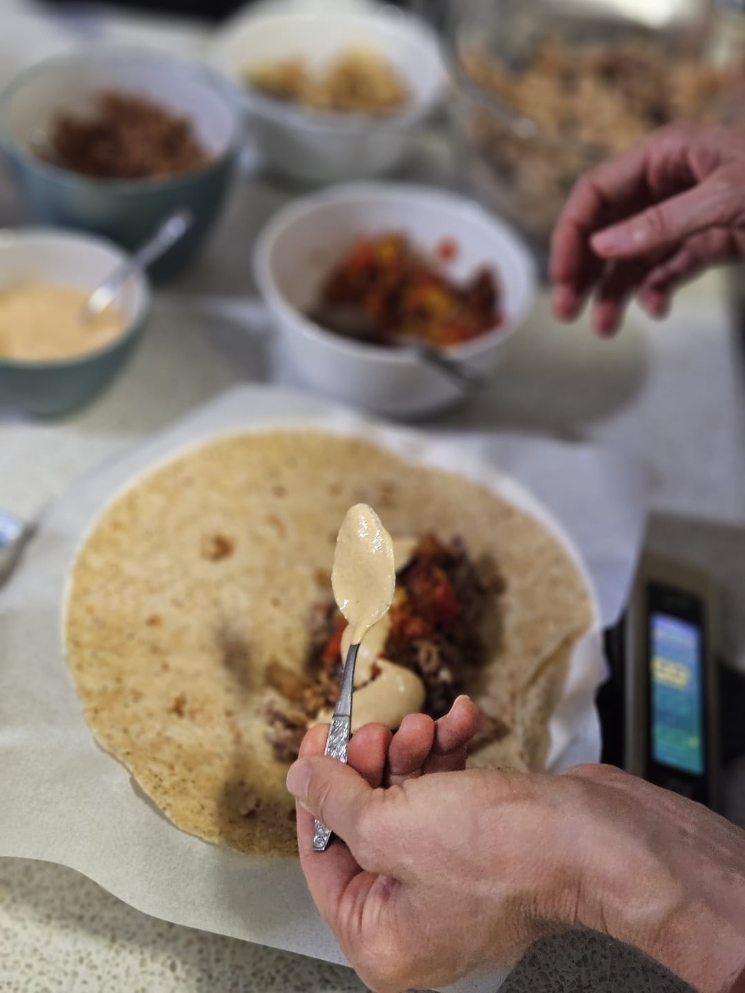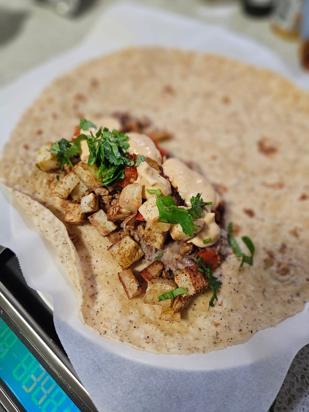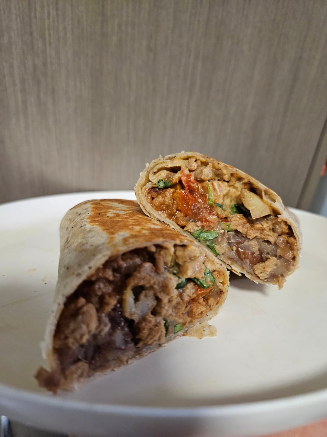 Freezer burritos inspired by this recipe but used some "refried" pinto beans I'd made a few days earlier in the Instant Pot, rather than the black beans. I also reduced the potatoes a touch and added some TVP mince with Mexican spices.