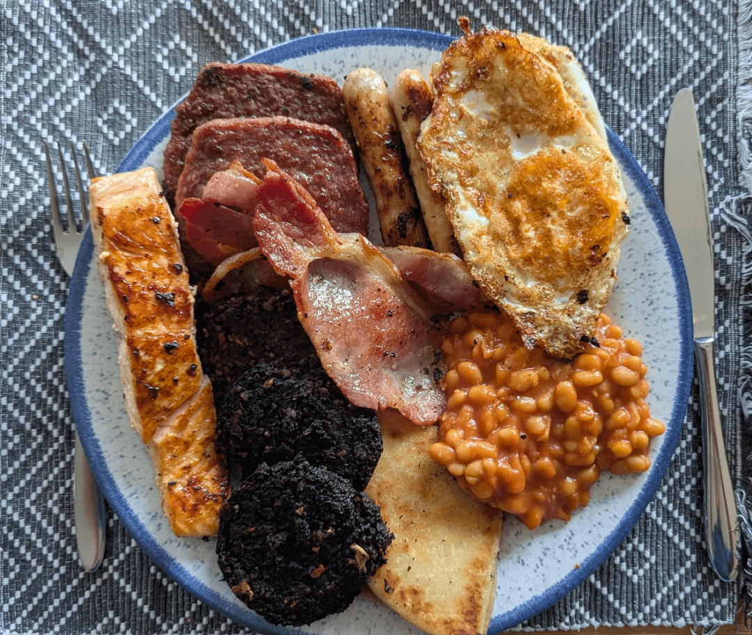 As for the controversial part. The salmon actually goes very well, particularly with black pudding. It's even got a strong enough flavour to work with haggis, somehow. I'd recommend giving it a go.