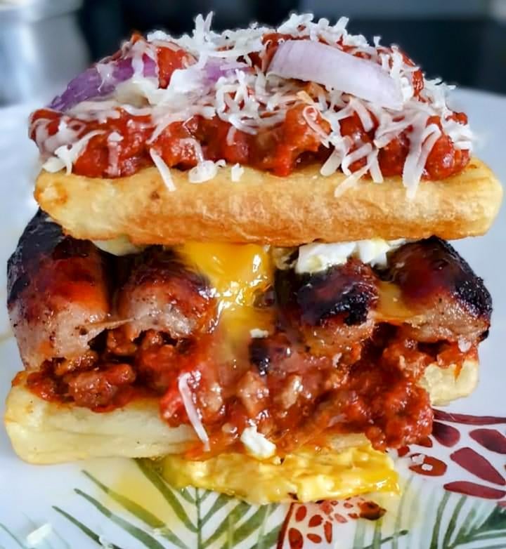 Potatoe Waffles, Bolognese, Pork Sausages, Poached Egg, Vintage Cheddar & Red Onion, Dripping with flavour…