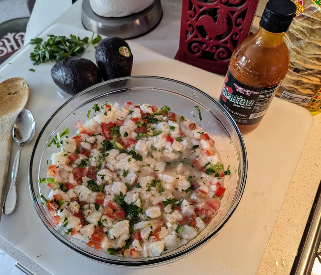 Made me feel like I was back in Ensenada.This is just cod, onions, jalapeños, cilantro, Roma tomatoes and lime juice. Marinated 45 minutes, spread on a tostada and topped with avocado and Valentina.by Ig_Met_Pet Dining and Cooking