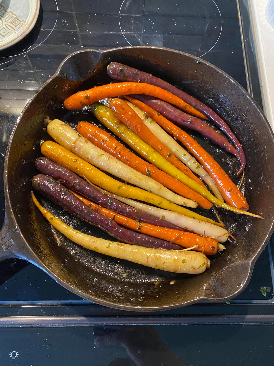 Glazed carrots, seared steaks in the cast iron and pan sauce.