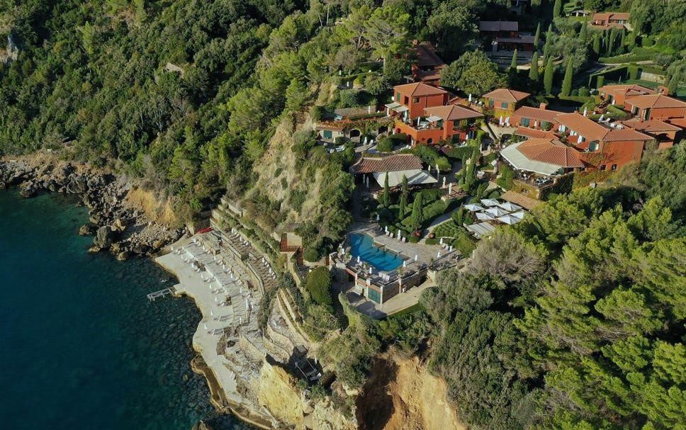 Arriving at Il Pellicano is an adventure unto itself: You’ll drive through the Tuscan countryside and then along the coast until you spot this hideaway, perched on the clifftop, spilling down Monte Argentario into the beautiful cove below.
