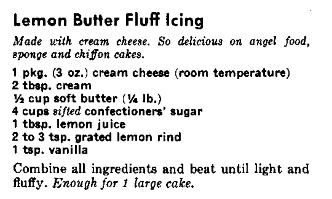 Make Lovelight Yellow Chiffon Cake (above)–except add 1 tsp. grated lemon rind with the vanilla. Spread Lemon Butter Fluff Icing (p. 175) between cooled layers, a white icing over top and sides.