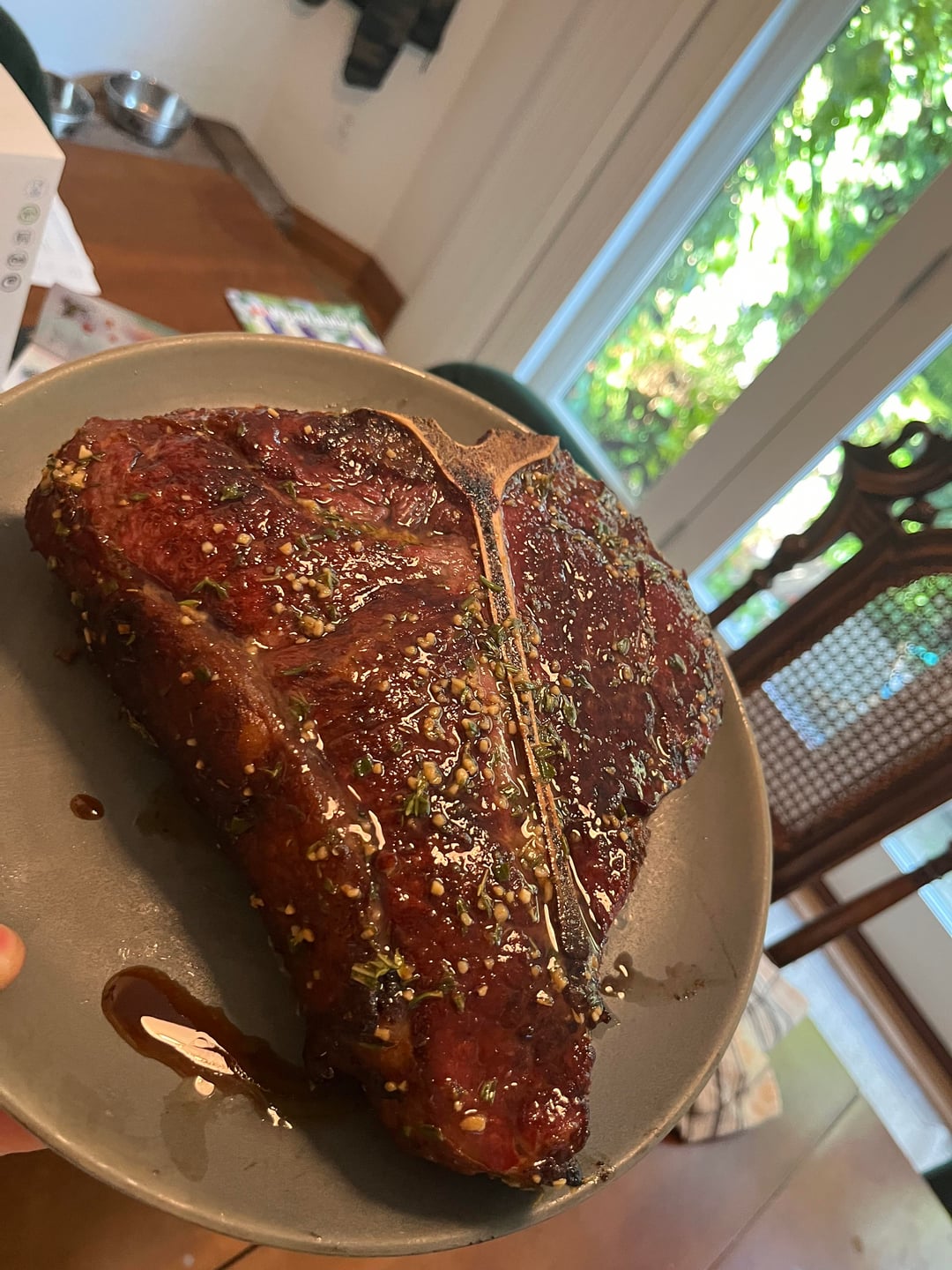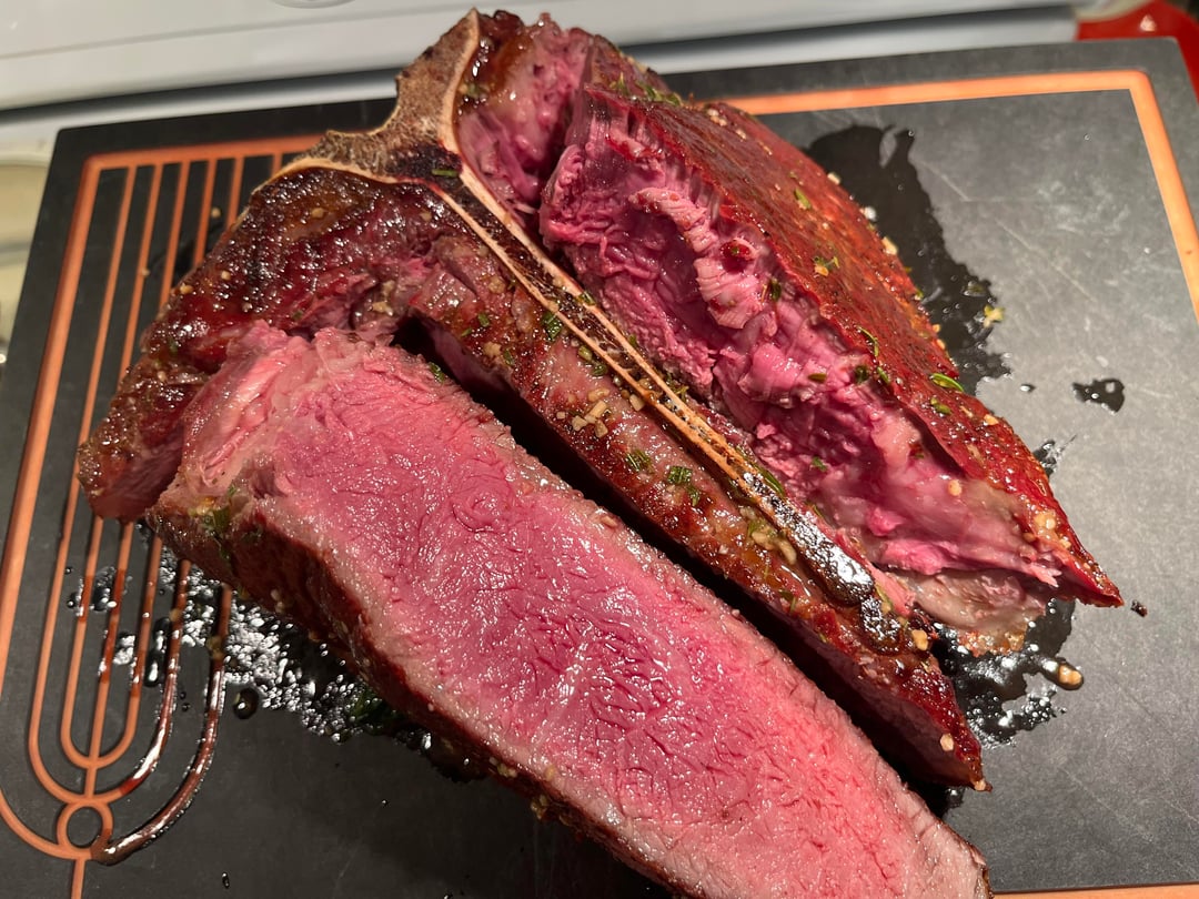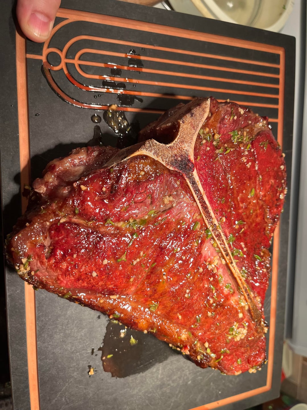 Took it inside, basted butter/garlic/rosemary/Barberians seasoning (Toronto steak house) in a fresh pan on low heat.
