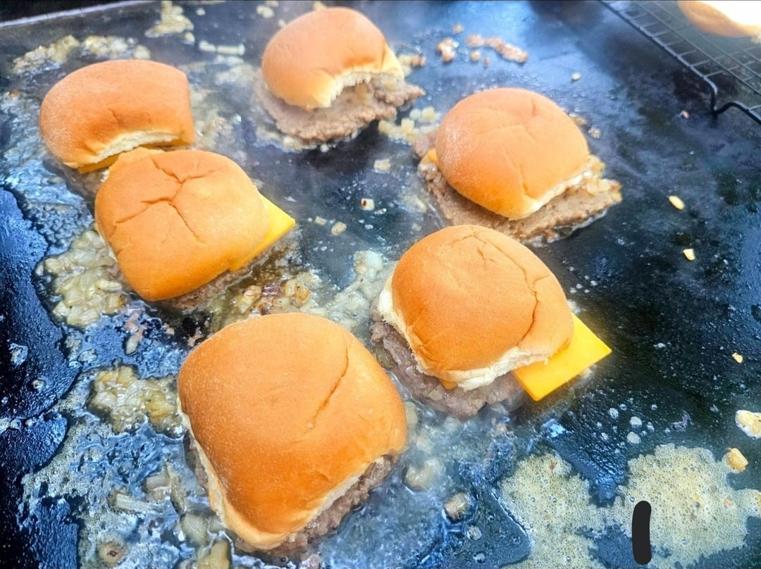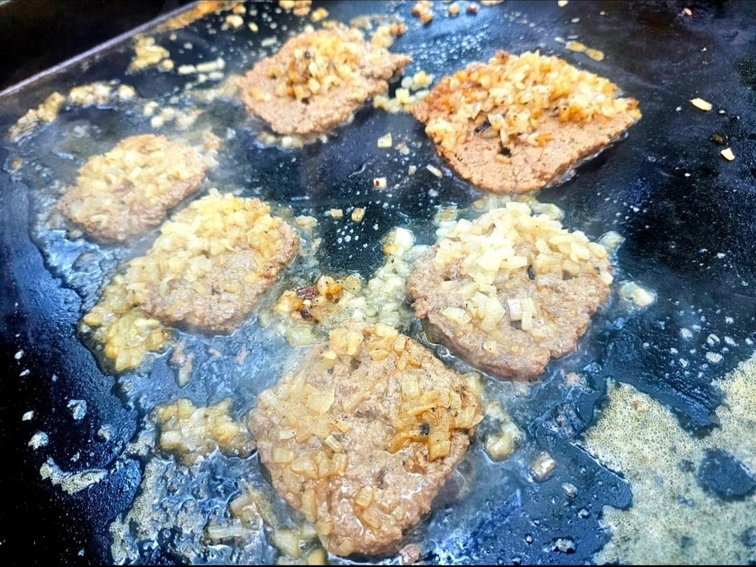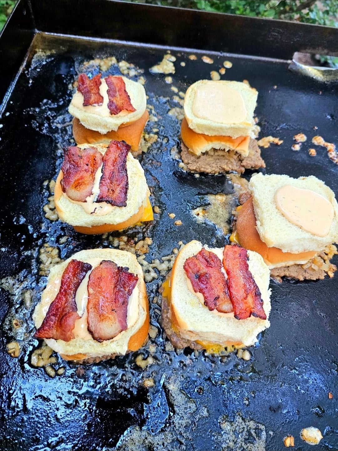 Start with cooking some bacon since bacon makes burgers better 😂 and then get the onions down. Burgers on top and squirt with water as needed to keep them steaming. Flip once, s&p to taste, add cheese, and throw the buns on top to warm. This is quick, easy, and ready to enjoy. It took longer to prep than to cook 🤣