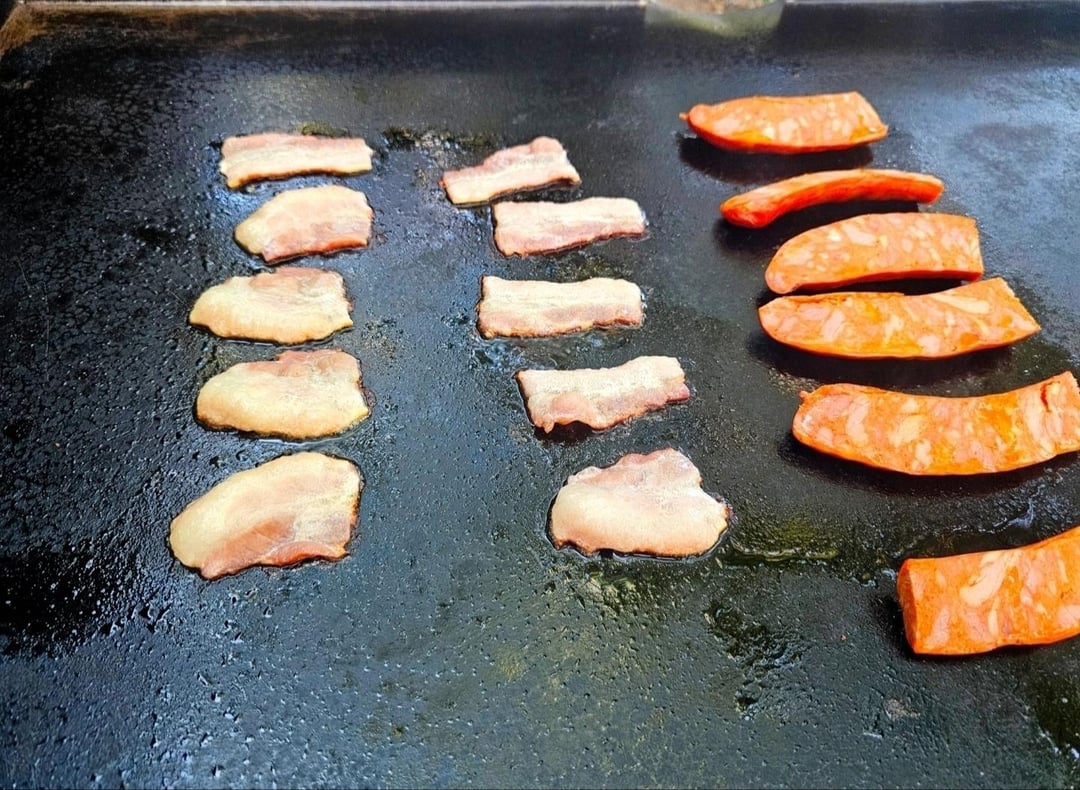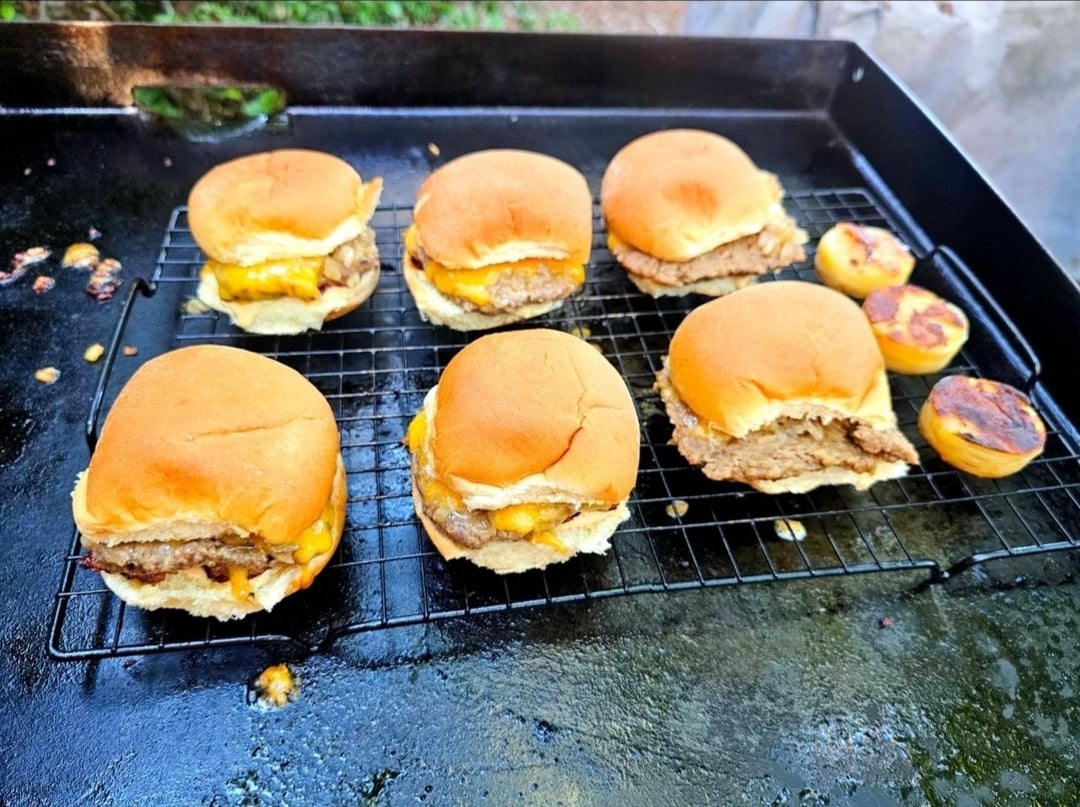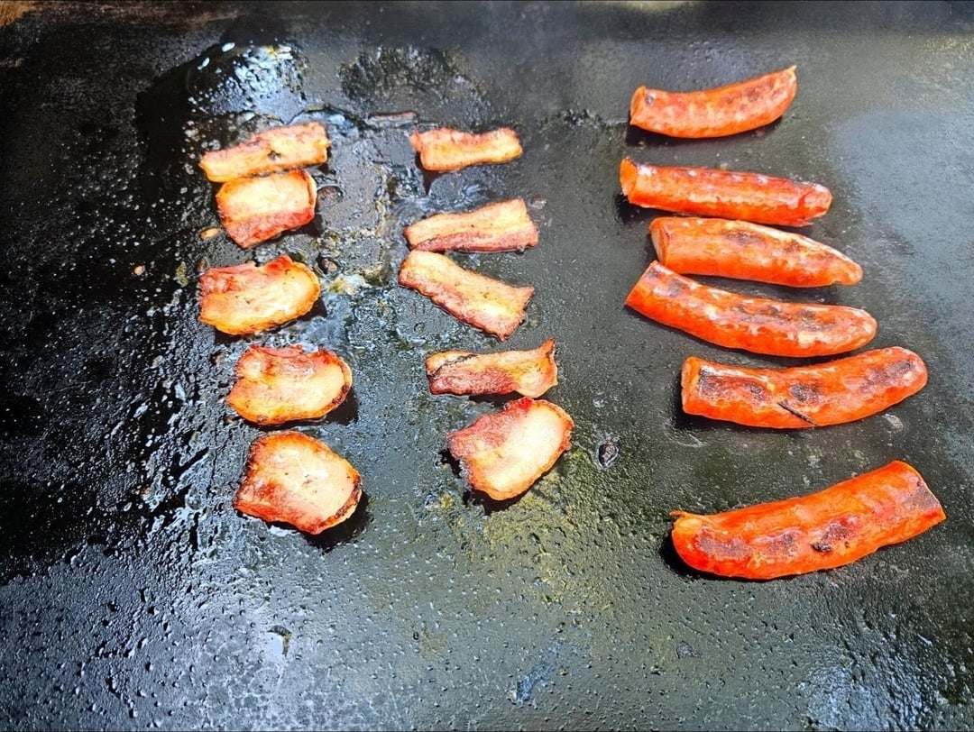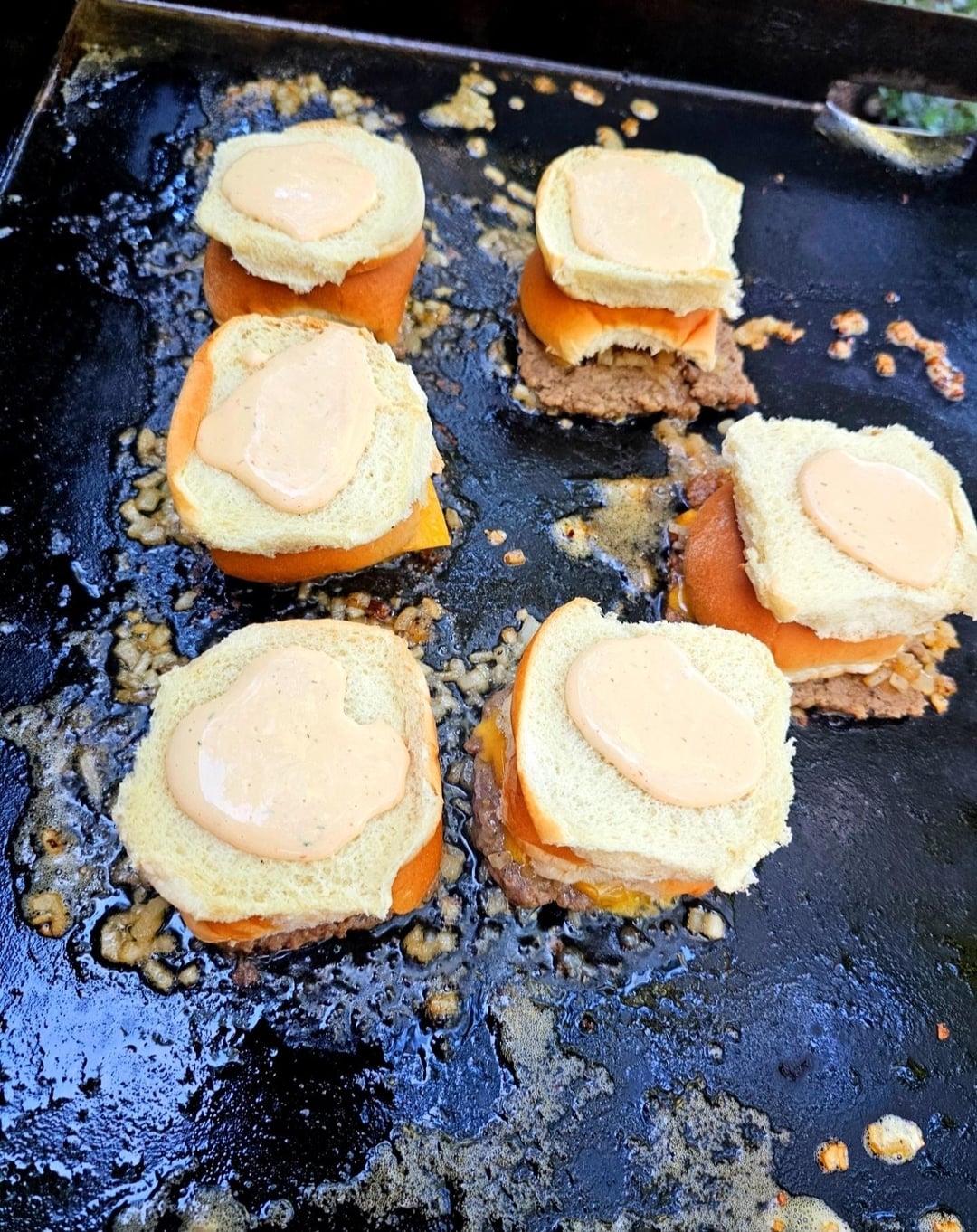 Start with cooking some bacon since bacon makes burgers better 😂 and then get the onions down. Burgers on top and squirt with water as needed to keep them steaming. Flip once, s&p to taste, add cheese, and throw the buns on top to warm. This is quick, easy, and ready to enjoy. It took longer to prep than to cook 🤣