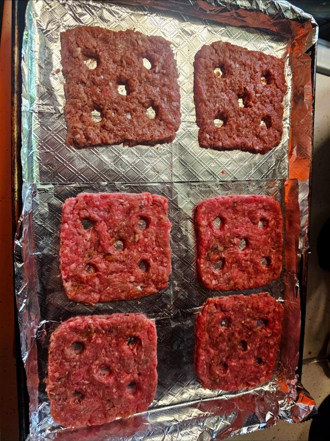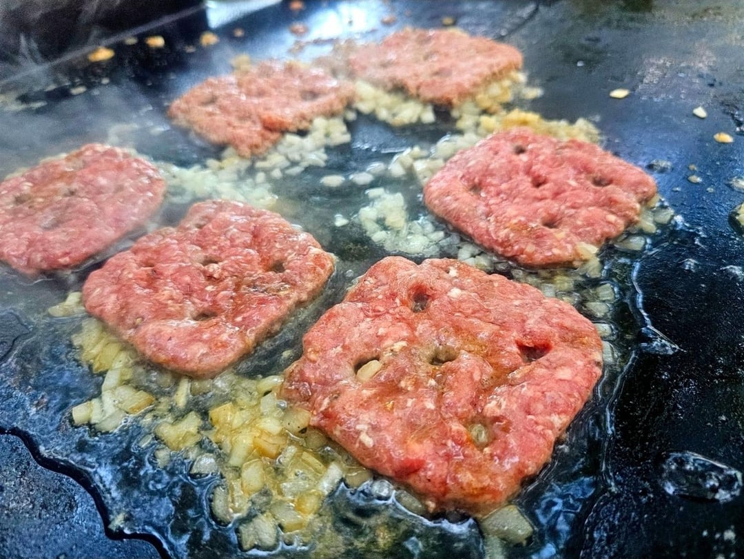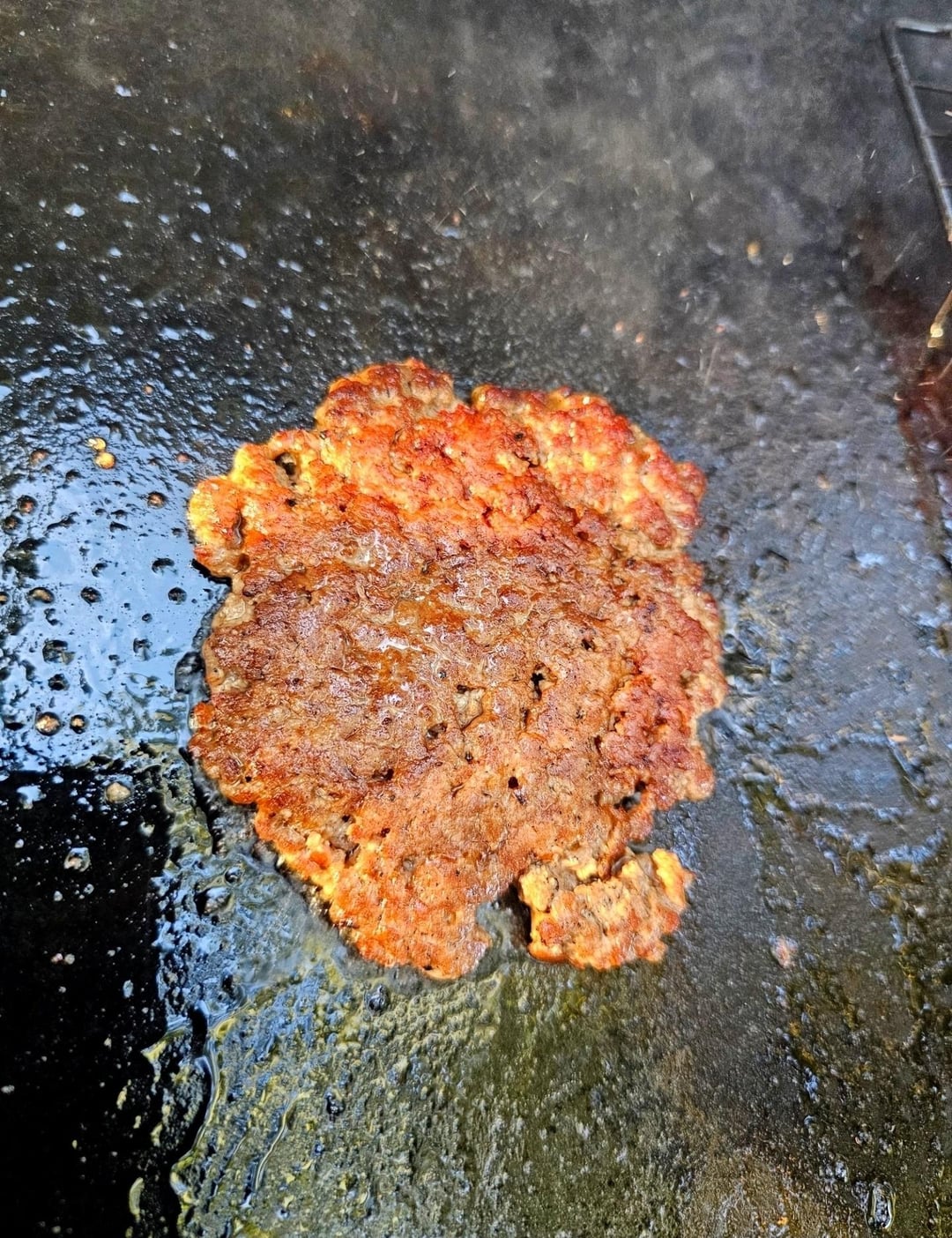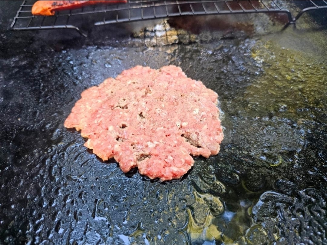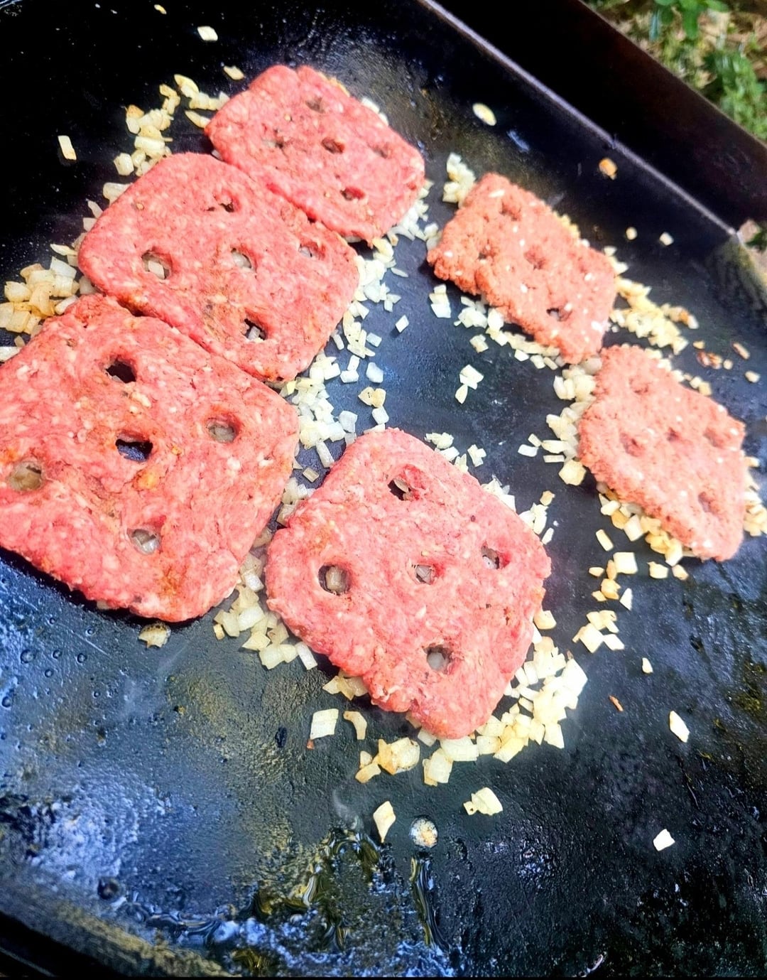 The impossible meat I don't eat but was told it tastes almost the same. It is a little harder to form into a square patty with holes, being almost frozen helped but the heat from your hands makes it get mushy pretty quick. I let them sit in the freezer until the onions were on and they held shape when flipping which was the goal.