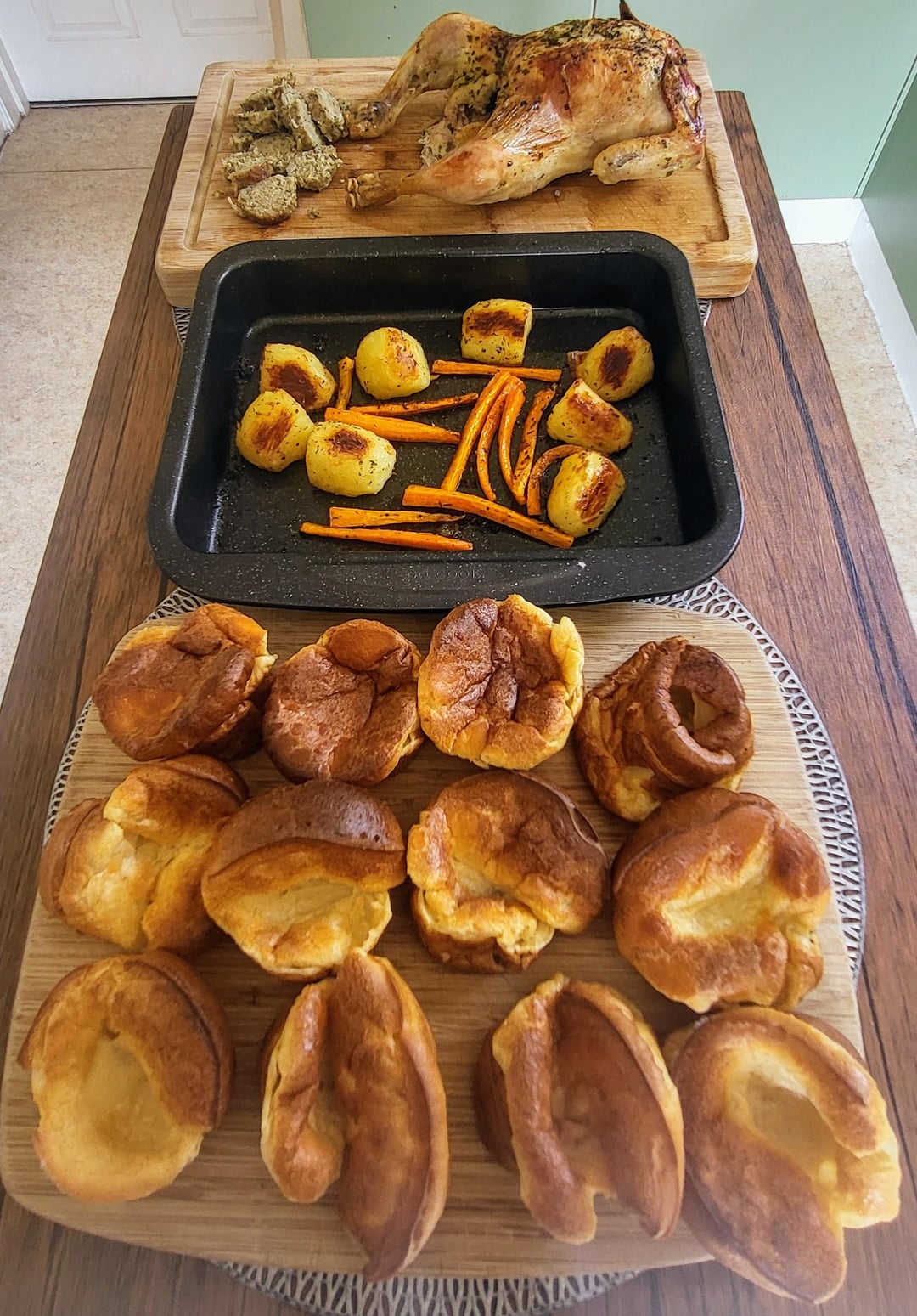 Today’s roast: roast chicken, stuffing, Yorkies, mash made with Maris Pipers & swede, white cabbage, roasties, carrots, broccoli, pigs-in-blankets, and proper gravy made with chicken juices.