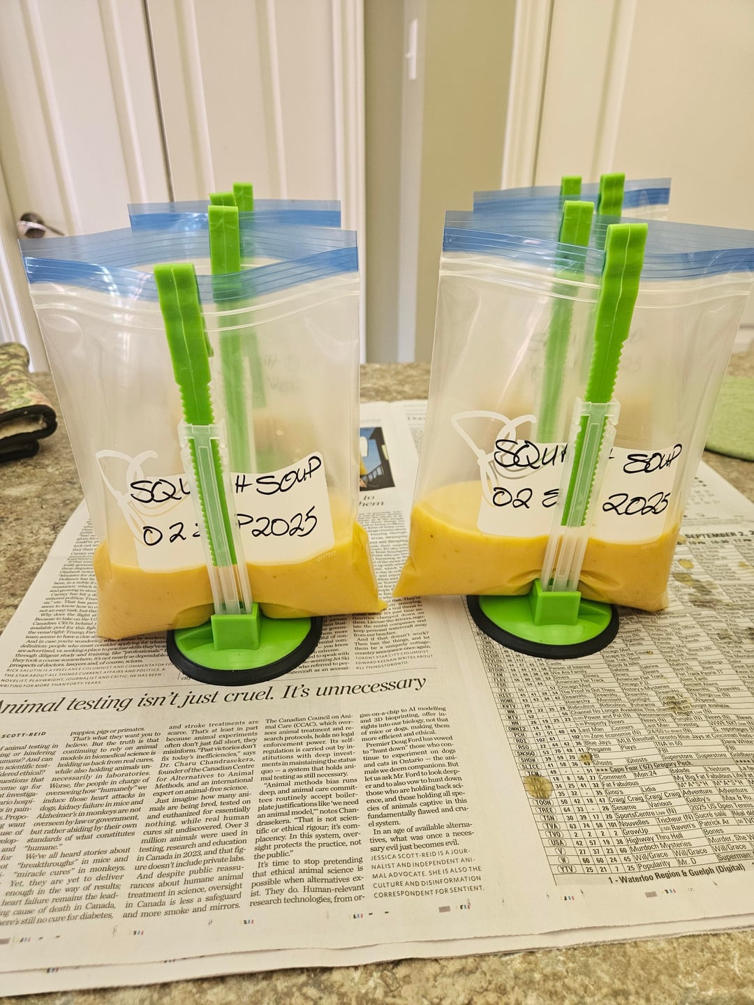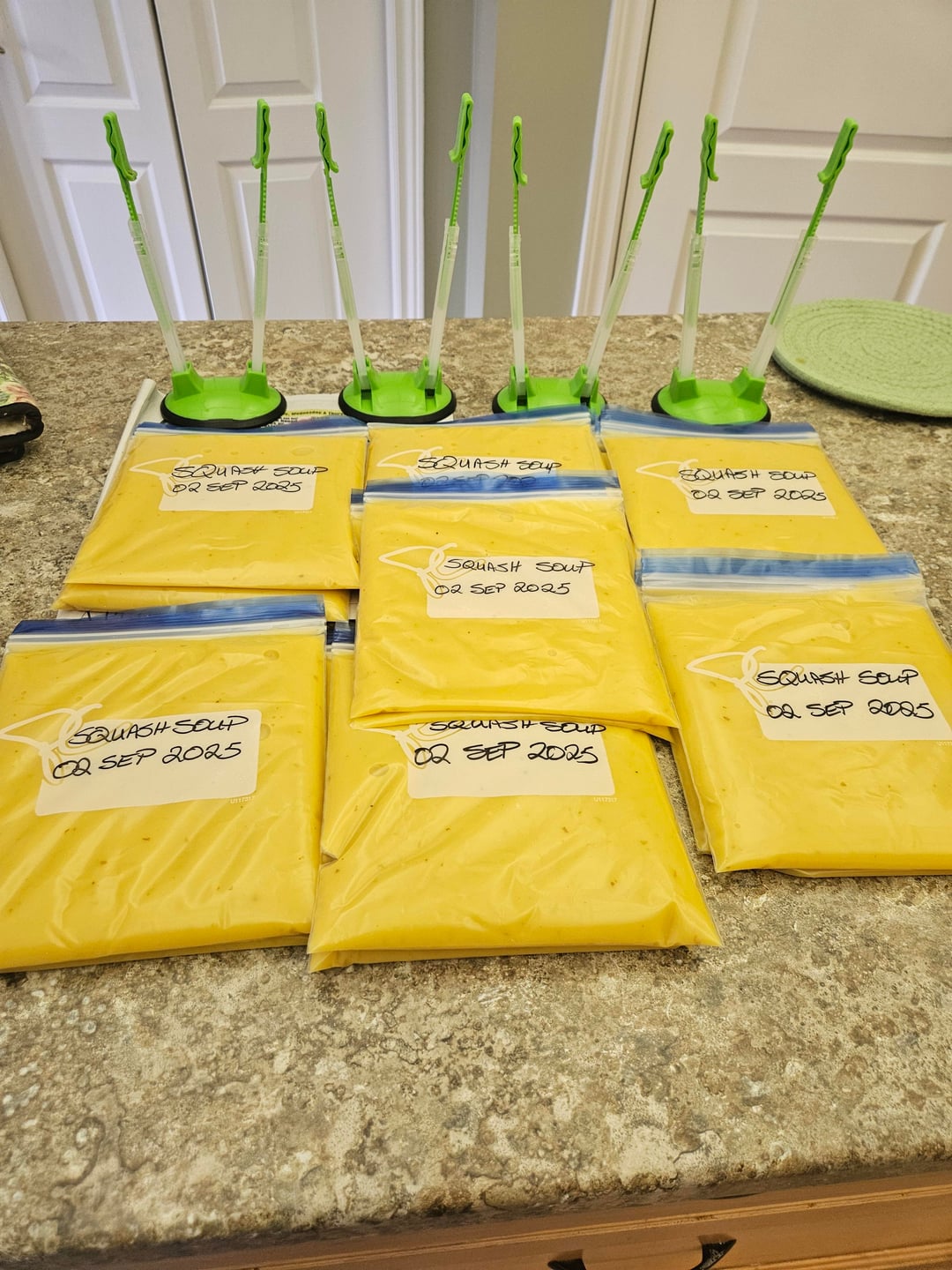 I did a double batch and packaged 14 meals. Some hints and cheats, because I'm here for a limited time; use frozen butternut squash, I use 2 750g bags of peeled and chopped squash, it saves time on peeling and chopping. I use frozen diced onion – a 1/2cup is a medium onion, a cup(8 oz) is a large onion. Use pre-minced garlic, available in jars. I use water and bouillon cube/powder for broth.