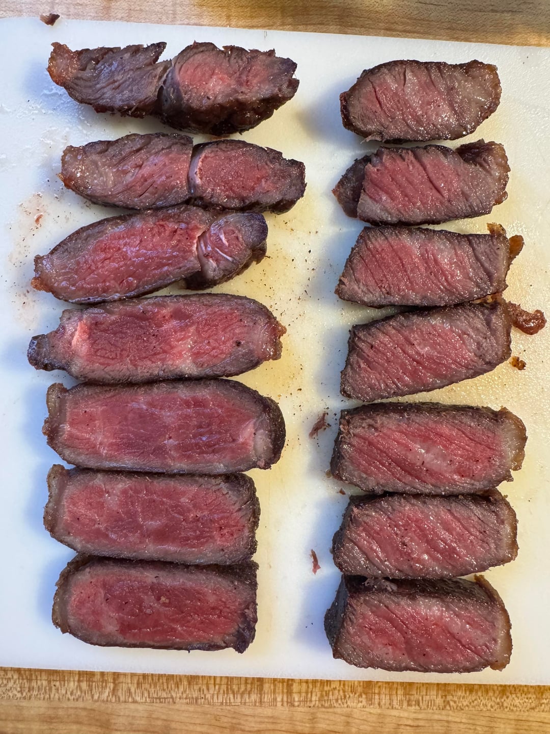 Steak tastes 10x better if you leave it whole and cut it fresh as you eat it. Slicing it up and laying it out like this is done for Instagram, but it honestly ruins the eating experience, in my opinion.