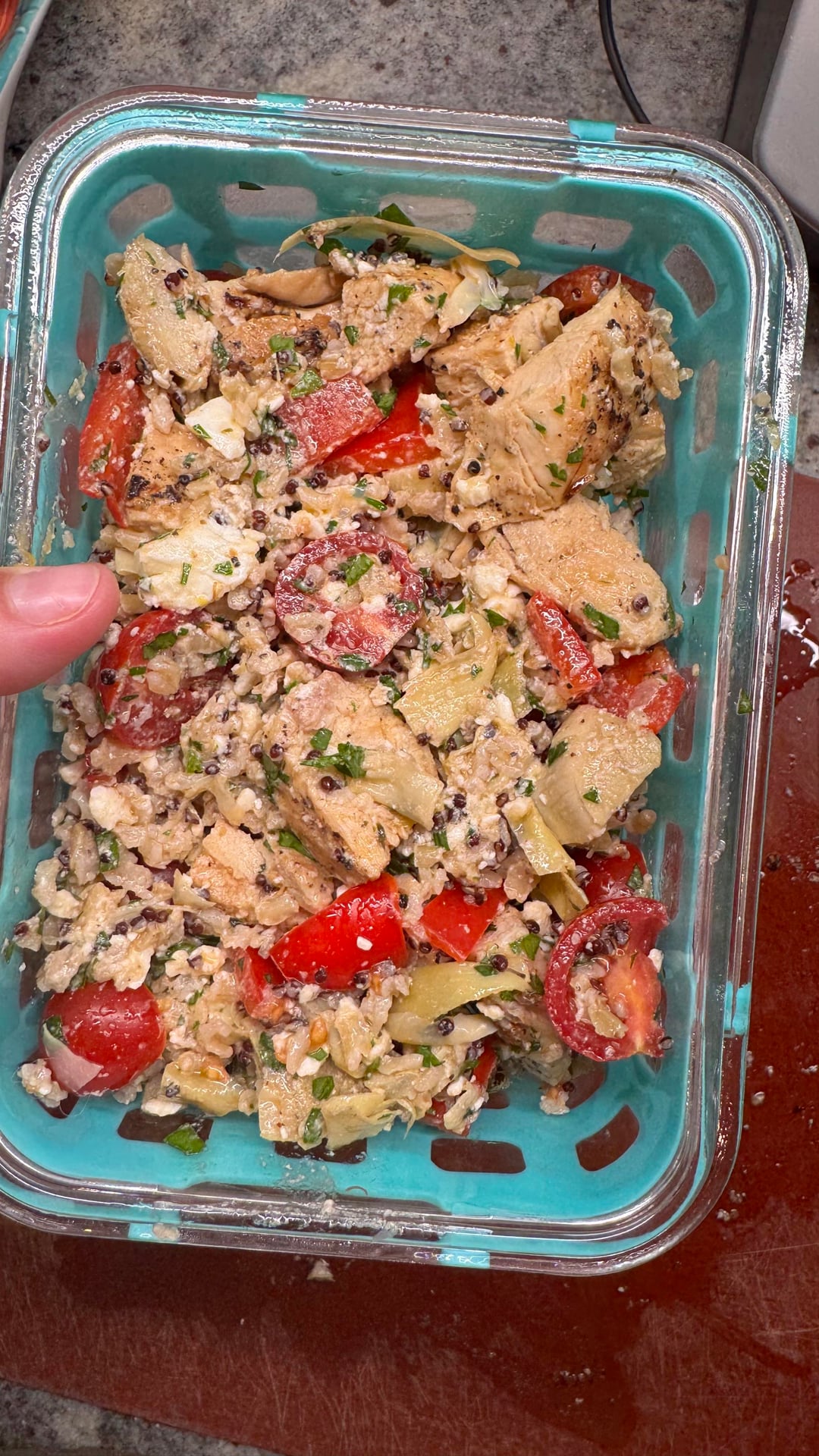 ingredients: 12ish oz chicken, can of artichoke hearts, grape tomatoes, red bell paper, parsley, feta. dressing made of lemon juice, garlic, olive oil, salt, pepper.