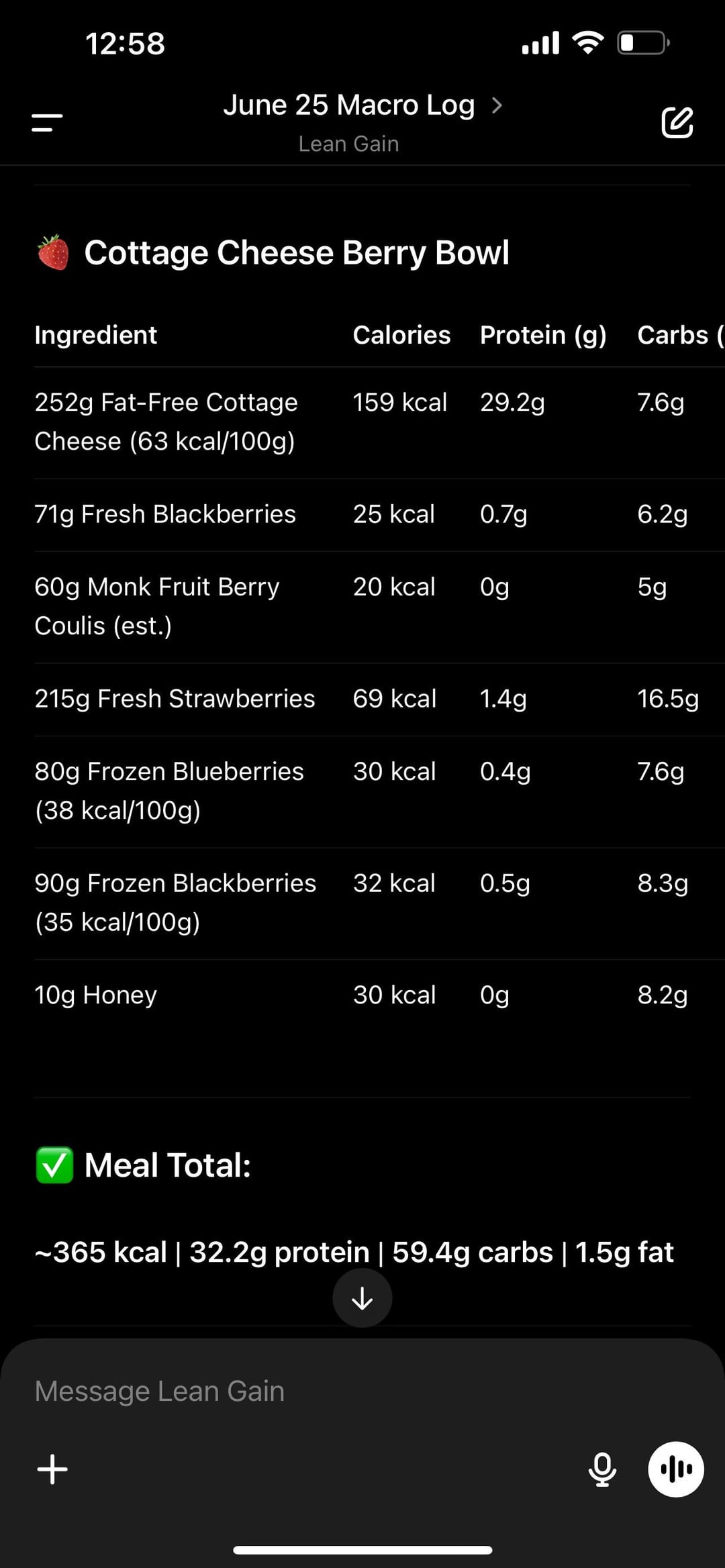 HUGE BOWL… you can’t even see the cottage cheese from all the berries. BUT it’s literally 30g + protein