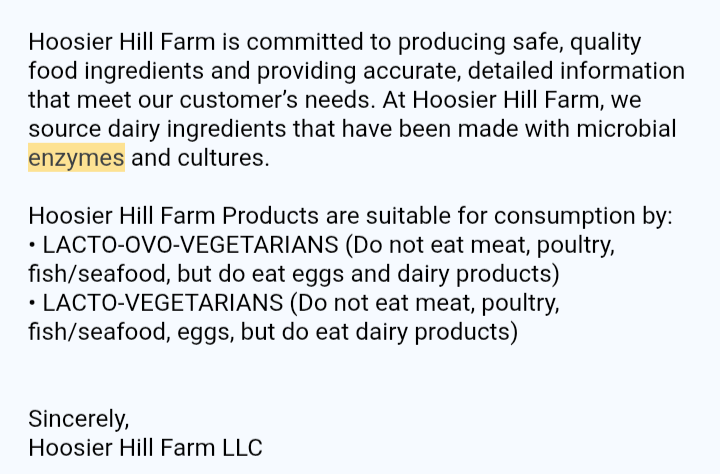 I emailed the company and they promptly replied within a day or two stating their products are vegetarian friendly. They sell large containers of cheese powder for sauce in many flavors including original, cheddar, white cheddar and Alfredo that can be purchased on Amazon and elsewhere. I just figured I'd share. ☺️