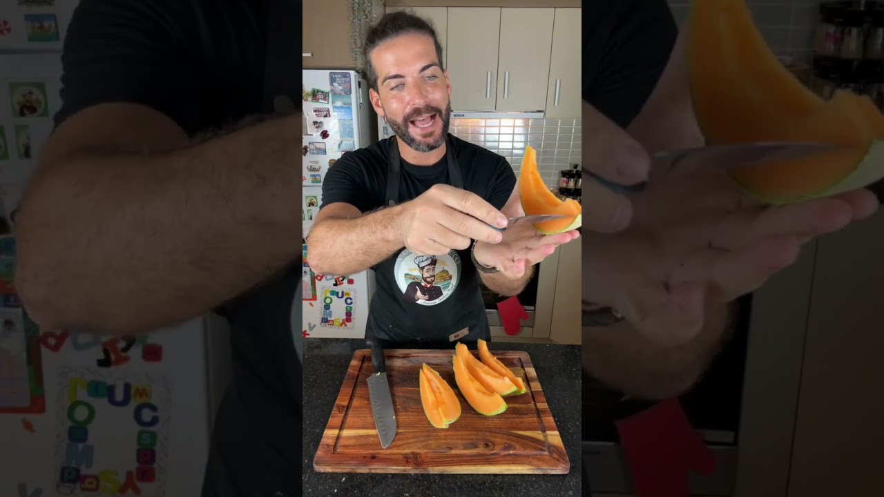 I’m going to show you an Italian entree that is probably from the 70s. Let’s go. Grab a rock melon. Cut it in half on the long side. With a spoon, remove the seed just like that. Then with your knife, simply cut the melon in slices just like this. Once we’re done, grab a smaller knife and cut the melon alongside the the skin, but don’t remove it all. So, basically, you still have the skin of the melon, but you can do that. Okay? So, you can go and eat. Okay? Now, do this with the other melon. Grab your prochto and for each melon slice, use one proto slice. So then simply as we have the space here, just flip this down and roll this around. Okay, there you go. Once you’re done, simply place it in a plate and enjoy an Italian entree that I’m sure you have seen it in all the tratoria. J.