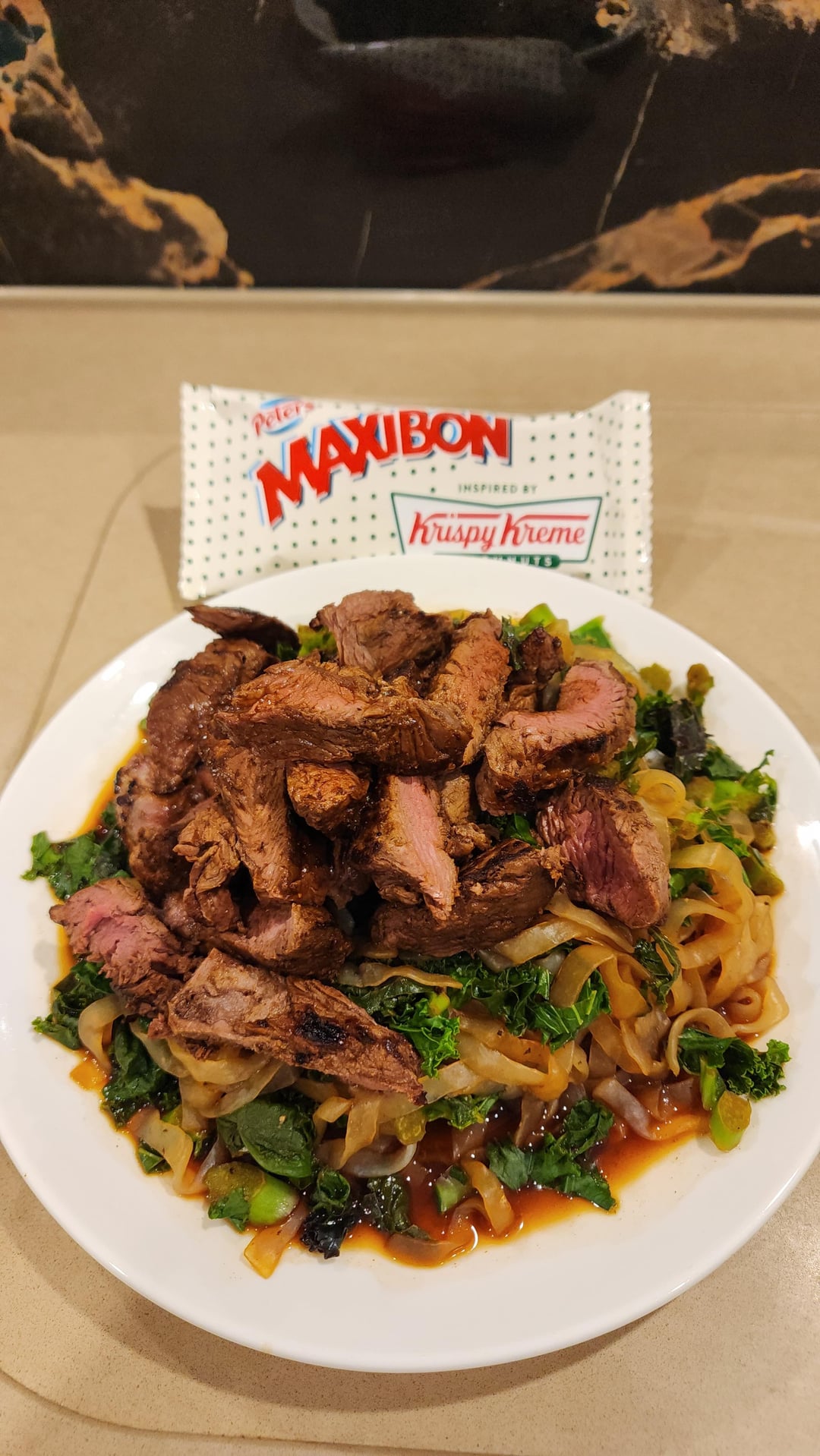 4 – Kangaroo steak on Konjac noodles with kale and spinich + cheeky maxibon