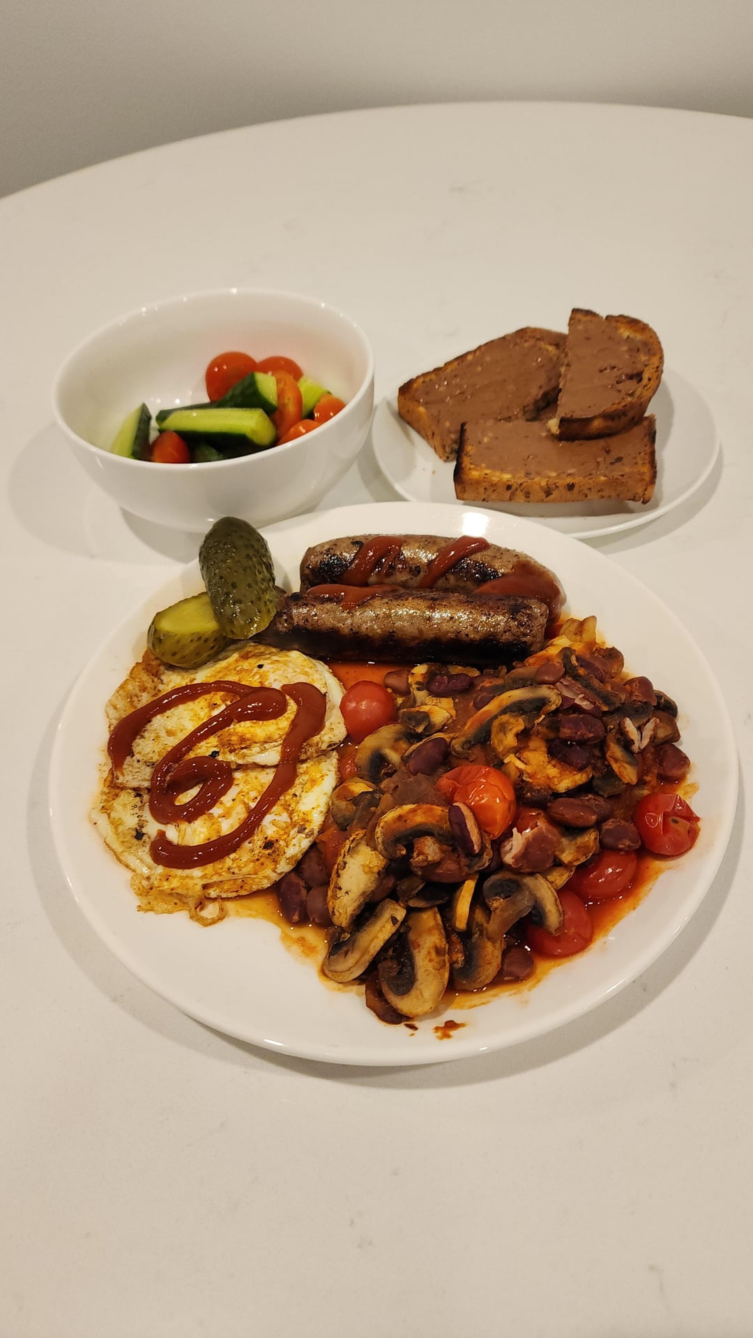1 – Extra lean sausages, pickles, eggs with low cal BBQ sauce, cooked Cherry Tomato, mushrooms, Mexican beans.