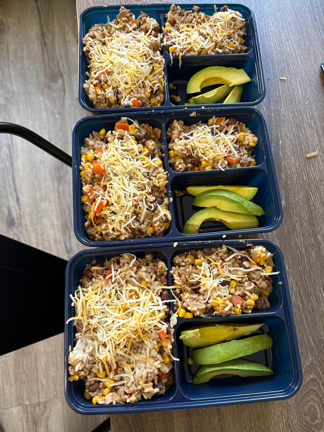 Lunch: TexMex Bowl with rice, ground beef, beans, corn, onion, bell pepper, cheese