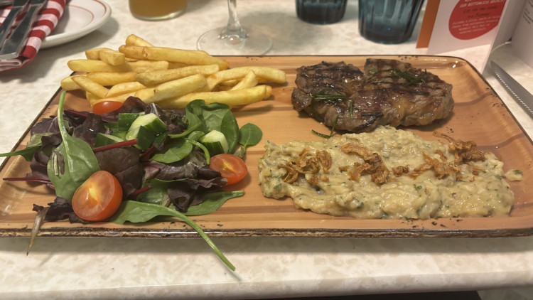 My companion opted for the Bistecca al Ferri (rib eye steak to you and me). Covered in lots of rosemary and garlic, this generously sized joint was fantastically cooked and served with a portion of crispy fries and an intriguing mashed aubergine salad and crispy onions.