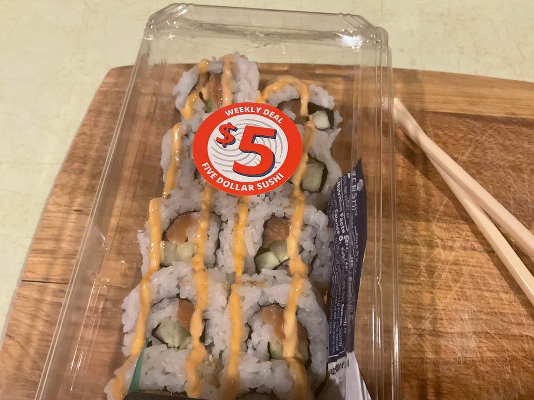 The last time my fiance bought 5 dollar sushi, it had mold on it and he ate it before he noticed the rest of it with the mold. Never again.