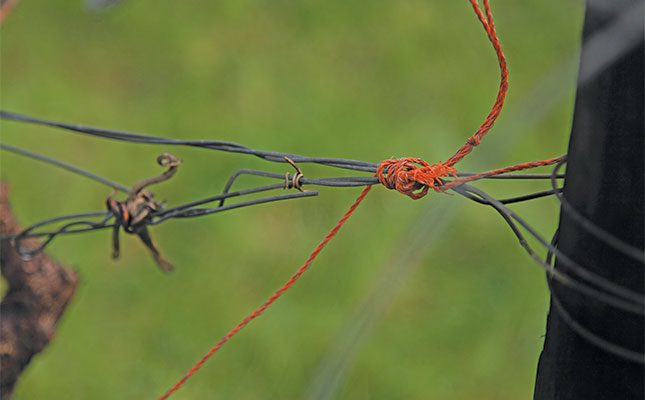 The electric fence is fastened to one of the wires of the vineyard‘s trellis system.