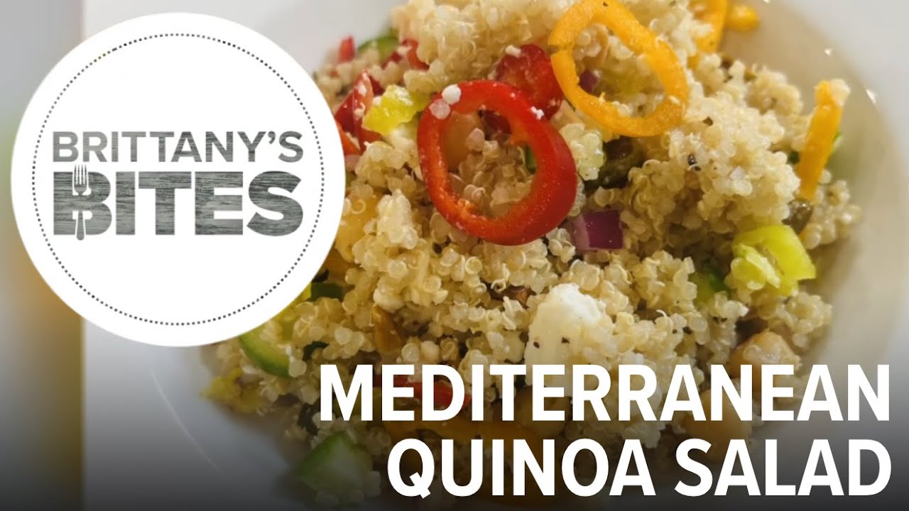 We are back with another Brittany’s bits, and this week I am making something I make fairly often, almost every week because I bring it to lunch with me. So if you’re into meal prepping, making something fairly healthy and you like the Mediterranean style, this one is for you. It is Mediterranean quinoa salad. Now, if you don’t like quinoa, you can always sub out brown rice. You can do some other sort of grain, whatever you’d like, or you can just make it with the vegetables and the beans and throw in some chicken, and then you will have a meal for the week. So Let’s get started with my quinoa. I’m going to basically just take a cup and you want to do a 2 to 1. So for every 1 cup of quinoa, you’re gonna do 2 cups of liquid. You can take it down from there or take it up from there, and you always want to measure out and then rinse off your quinoa. So I’m gonna do that with my little quinoa here. I’m gonna do a cup of that and then 2 cups of broth. Now you can always do water as well, but I like to boost the flavor, so I’m using some veggie broth. You can use chicken broth, maybe beef broth. Whatever you have and then you’re gonna put it on the stove, boil it, and then once it comes to a boil, reduce it for about 15 minutes and it’s as easy as that. So I’m gonna take care of all of this. So again, just over on the stove. I’m gonna put it on there, bring it to a boil, simmer it for 15 minutes until it soaks up and absorb all of that broth, and then we’ll be ready for the next step. OK, we’re back with our fully cooked quinoa. It’s nice and fluffy now. And when it was still warm, I took some Greek vinaigrette and put it in so that it. would absorb it all and take in that flavor. So we’ve already sort of got a flavorful base, and now comes the fun part. I did a little prep work in the meantime, and that is why this is also a quick and easy recipe, because once you get this on the stove, you can start chopping up and preparing your other ingredients. So what are those ingredients? Well, the first one’s pretty easy garbanzo beans or chickpeas, if that’s what you would like to call them. I just have one can of those and of course I drain them and then rinse them off. And so they’ve been sitting here in this. I’m gonna pour those in. And then next I have two little Persian cucumbers. I’ve also used English cucumbers. I just like them because they’re mostly seedless and I feel like they have a little more texture as well, so I’m gonna pour those in. This also has tons of great color, right? Just looks appetizing. You eat with your eyes first, right? And then you have those little sweet peppers, those mini see. List sweet peppers that you can find in the store. I love those as well. They save so much time because you don’t have to see them and I just chop them up and they’re so pretty. I have an orange one or a yellow one and a red one in there. Then I have some very finely diced red onion. Now if you don’t love the taste of raw onion, you can. Cook it if you’d like. You can soak it in some cold water that sort of takes the harshness out of it sometimes, but I love it. So I just dice it up really small and put in as much as you like or as little as you like. And then just to give it a little tang, I have the pepper and cini that you can get in sort of the tall jars. Well, I chop this up just to make the bites a little bit smaller. I’ve got that. And then what I’m gonna do is add a little spice. So this is the tar and this is a Mediterranean seasoning. You can add whatever seasonings you like, even if it’s just salt and pepper or no seasoning because you’ve already got some of the vinaigrette in there. So I’m just gonna do a little sprinkle of that and then this Greek seasoning all purpose, you’ve probably seen in the store plenty of times I’m gonna put some of that in. And then the very last thing I’m gonna do because I love texture and I love to give it a little crunch, I’ve got some roasted lightly salted pistachios that I’ve also chopped up a little bit. Oh, and of course I can’t forget this feta cheese. So I’m just gonna put some crumbles in here and then we’re gonna mix everything together. And as I mentioned before, I don’t really have exact measurements for everything. You sort of, you know, add with love, with your heart, right? Whatever you want, how much you want. And then look at how this is all coming together. It looks so beautiful and this is a great dish that you could take as a side dish, especially to a summer cookout or grill out. And hopefully people will love it, but I just divide this up then into my meal prep kits, and I have it for lunch during the week. So it is all ready now. You can give it a little taste and see if you want to add a little bit more dressing or a little bit more spice, but I’m gonna trust it at this point and just scoop it into a bowl. So you can get a better look at it, whoop, and spill it everywhere. You know, if you’re not getting messy in the kitchen, you’re not doing something right. OK. That is our finished product. This is the Mediterranean quinoa salad. I hope you give it a try. You’ll have the same lunch as me. Cheers.