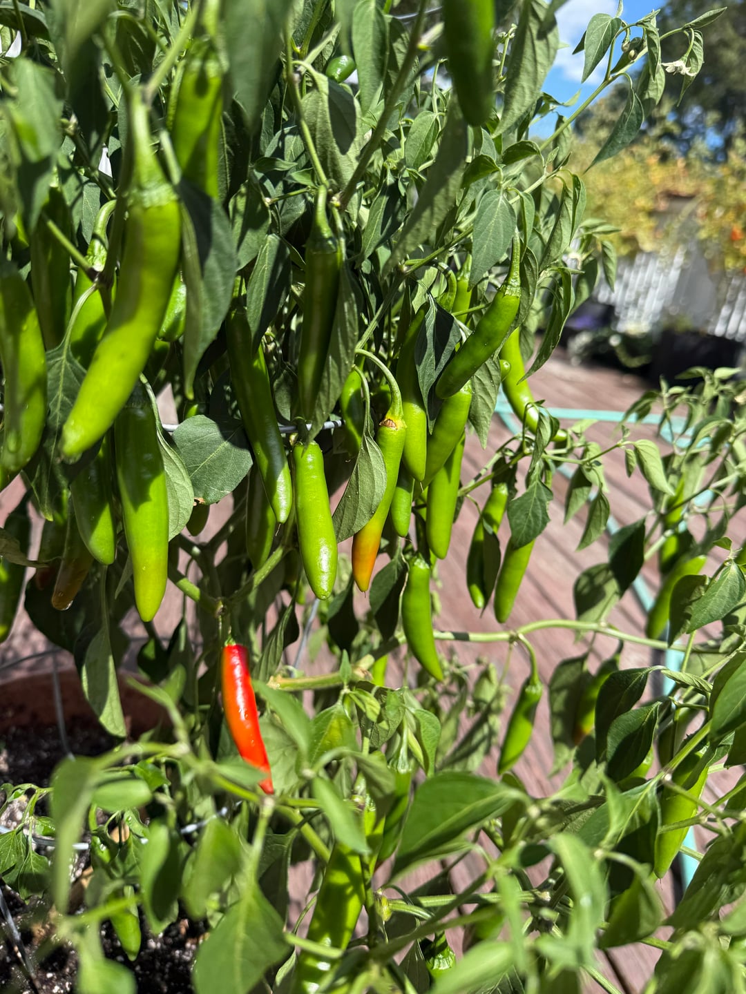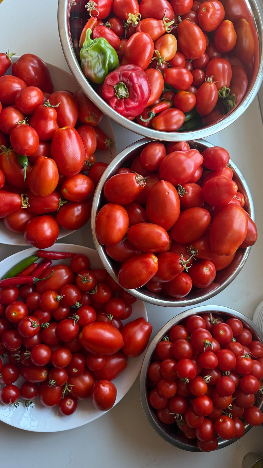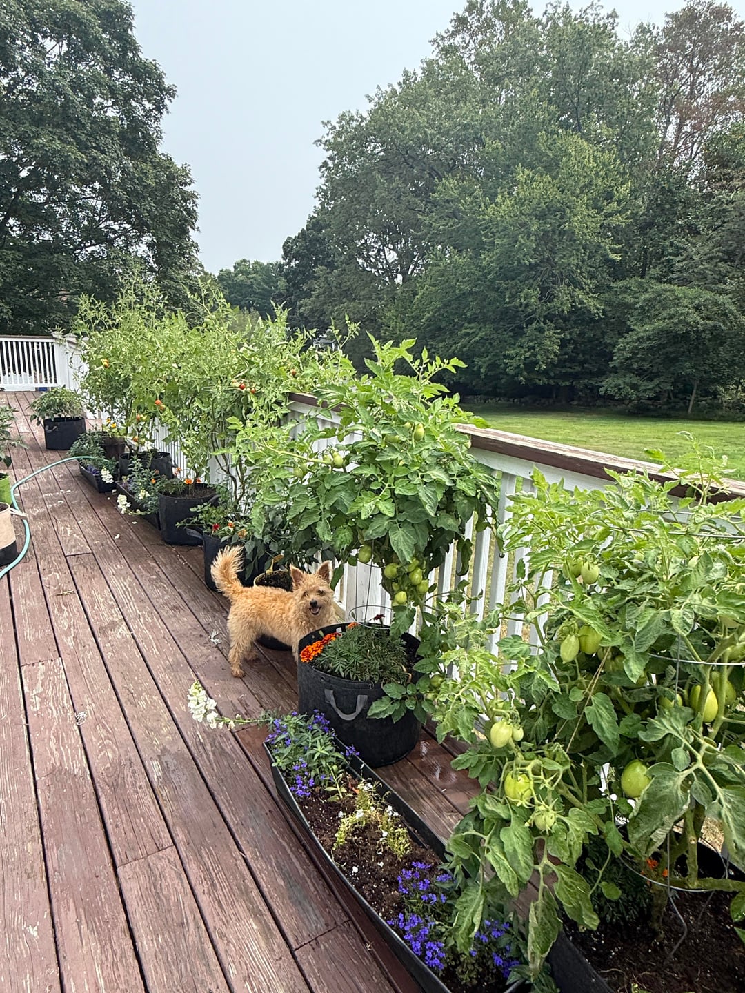 Thrilled that our tomato rookie year went so well. 7 plants (4 cherries//3 Roma), everything started from seed and grown in containers on our deck. Over 20+ lbs of tomatoes (stopped weighing) Now just waiting on some peppers πŸŒΆοΈπŸ«‘. (Bonus pic of the Gard(ner) dog from earlier in the season.)