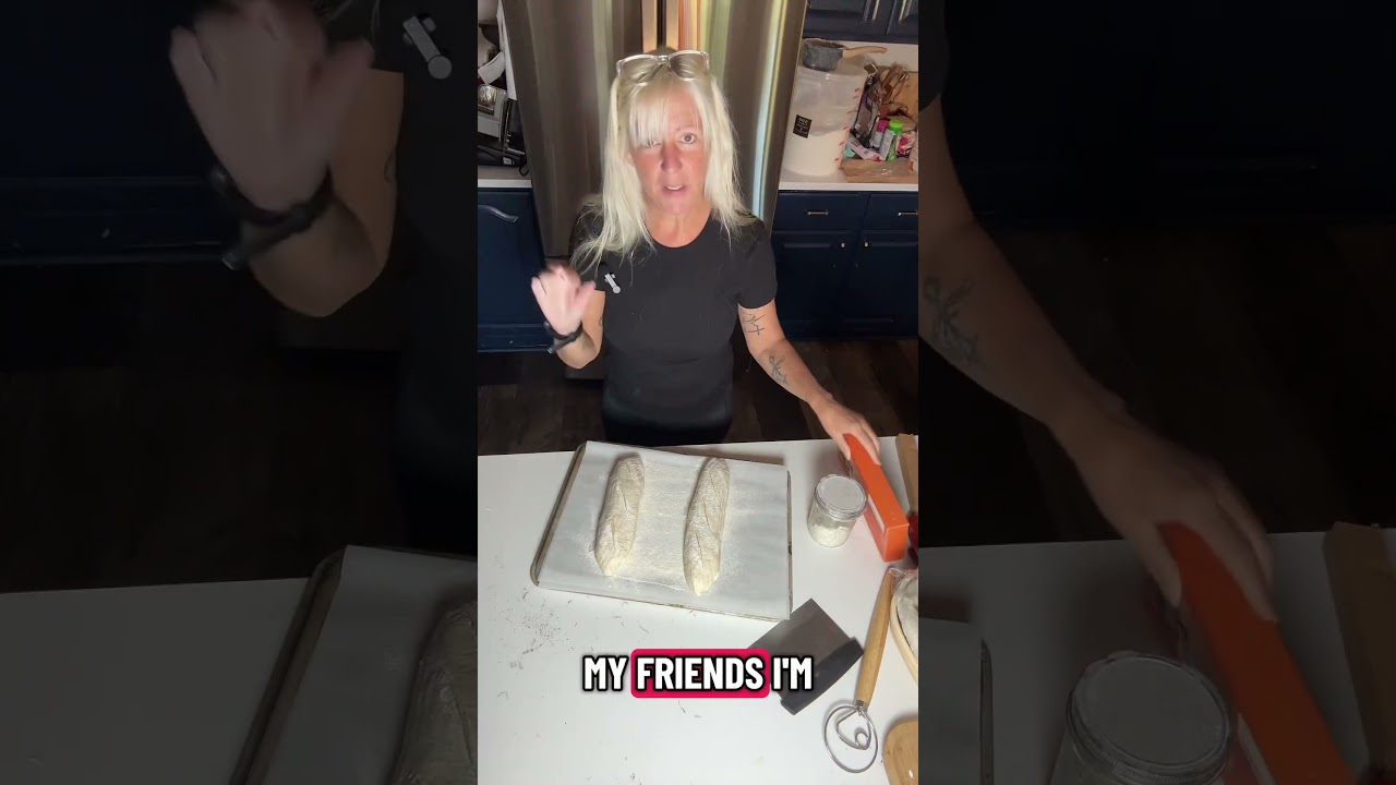 All right. So, we did the mix with our Danish whisk and now it has fermented overnight in the refrigerator. We’re going to turn it out. It’s got that beautiful striation from the basket and we’re going to use our bench knife to go ahead and cut that into two. We’re going to make some faux demi baguette. So, we’re going to go ahead and sprinkle that with some flour. Now, you’re going to take the cut side down just like so. going to sprinkle with a little bit of flour and we’re going to take our blade and we’re just going to make some straight cuts here to give it some expansion. All of this comes in this kit. So, if you get one of these, you’re good to go. All right, my friends. I’m going to put these in the oven and I’ll show you what they look like. After 40 minutes, these beautiful demi baguettes are baked. Look at how delicious they are. They’ve got a nice blistering from good fermentation, nice bloom from the cuts. Really happy with these. I hope you’ll try. Make sure you get the right tools. These Danish whisks and the bench knife and the lame makes all the