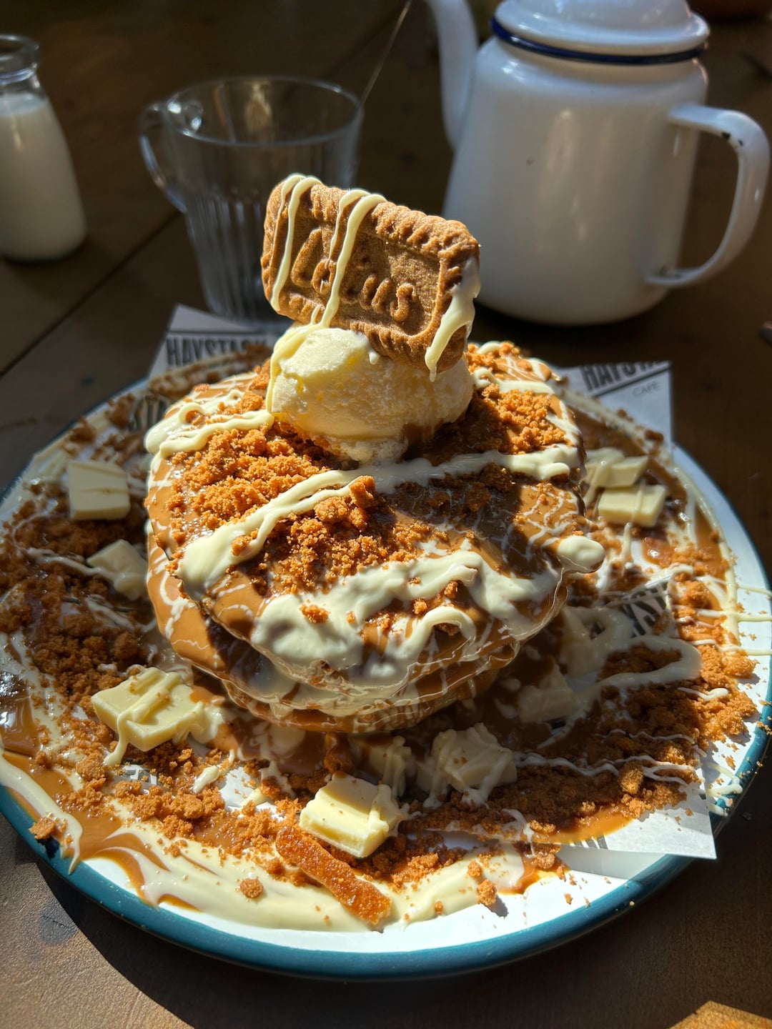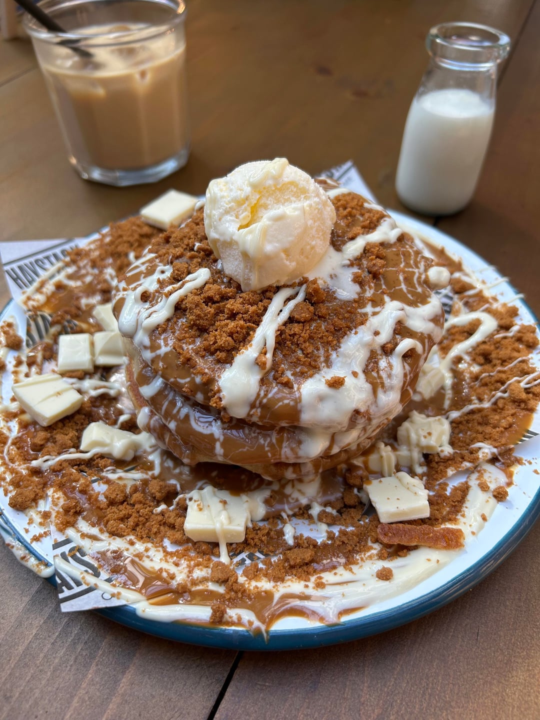 This was a 4 tiered pancake stack with Biscoff sauce, white chocolate sauce, white chocolate chunks, Biscoff crumble and ice cream?