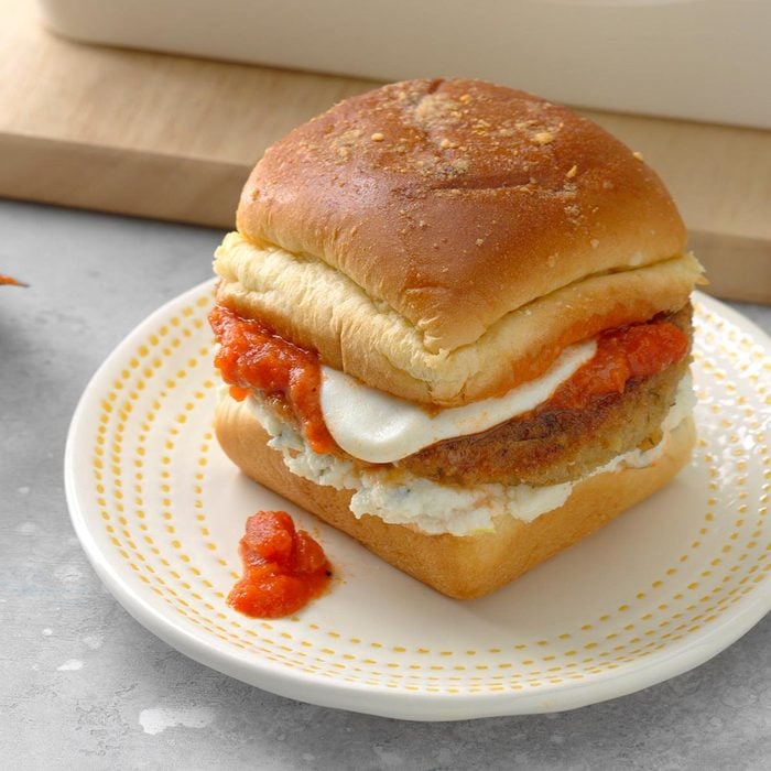 Sliders are the perfect finger food for any get-together, and this flavorful chicken Parmesan version won’t disappoint. —Nick Iverson, Denver, Colorado