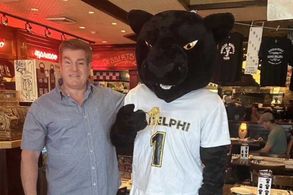 Vincent’s Clam Bar owner Bobby Marisi with the Adelphi University mascot. Courtesy of Bobby Marisi