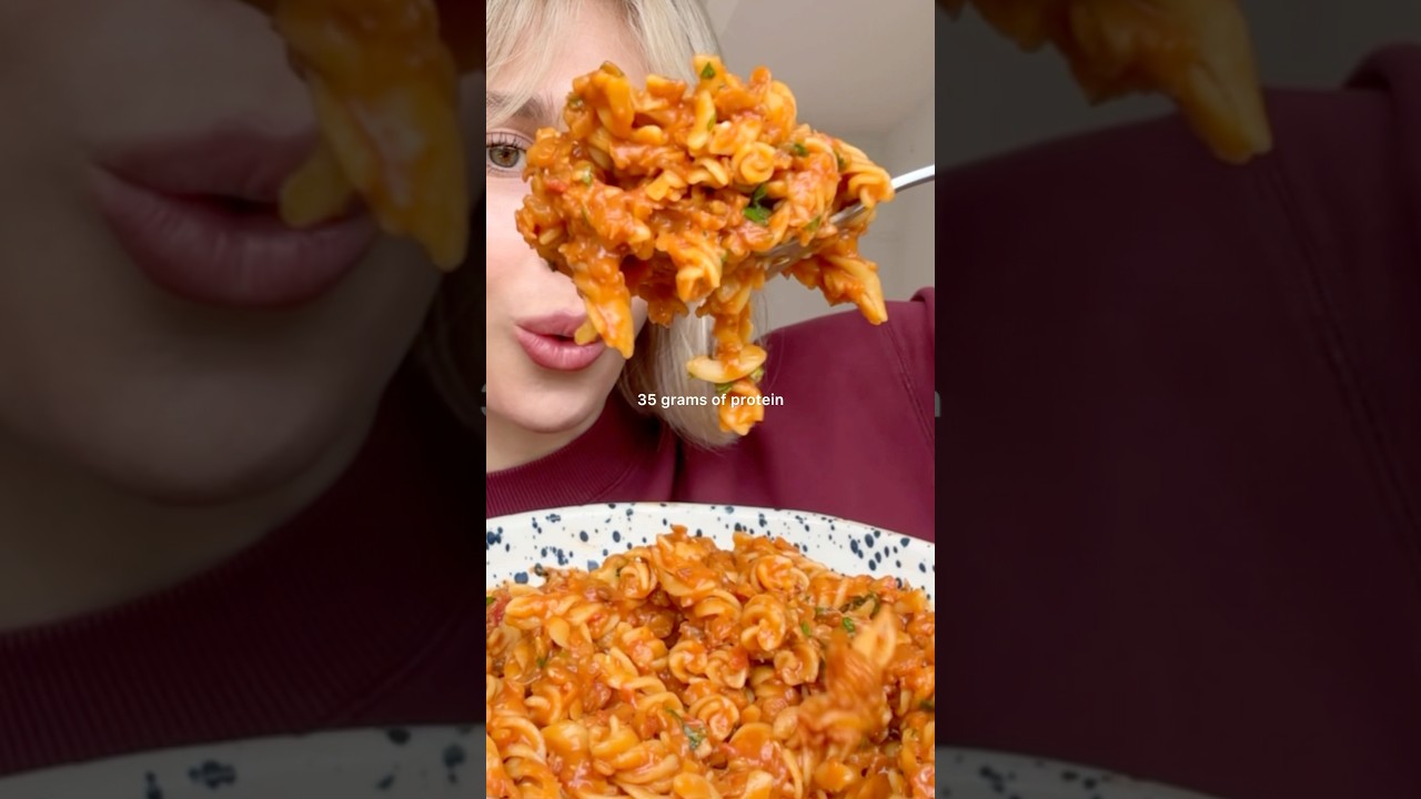This pasta packs over 35 gram of protein per serve, and it just so happens to be plant-based. It’s my smoky red lentil pasta. Perfect for a midweek dinner or for meal prep. Begin by sautéing onion, garlic, and spices. Then in with the condiments: tomato paste, Dijon mustard, tamari, balsamic vinegar, and rice malt syrup. Then you cook those for a few minutes before adding crushed tomatoes, vegetable broth, and the red lentils. Cook until thickened and the lentils are tender. Then mix with a red lentil pasta. Garnish and enjoy.
