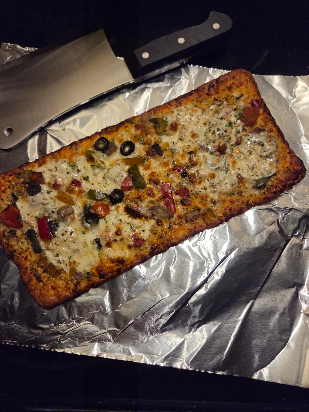 7$ Walmart marketside cauliflower crust roasted veggie. I overcooked it a little