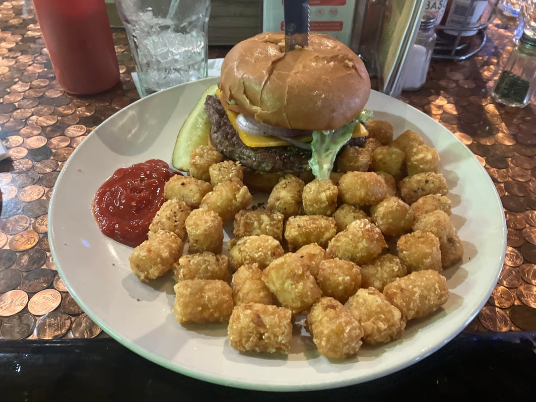 Build your own burger at my local bar. $11.24 with the tots upgrade.
