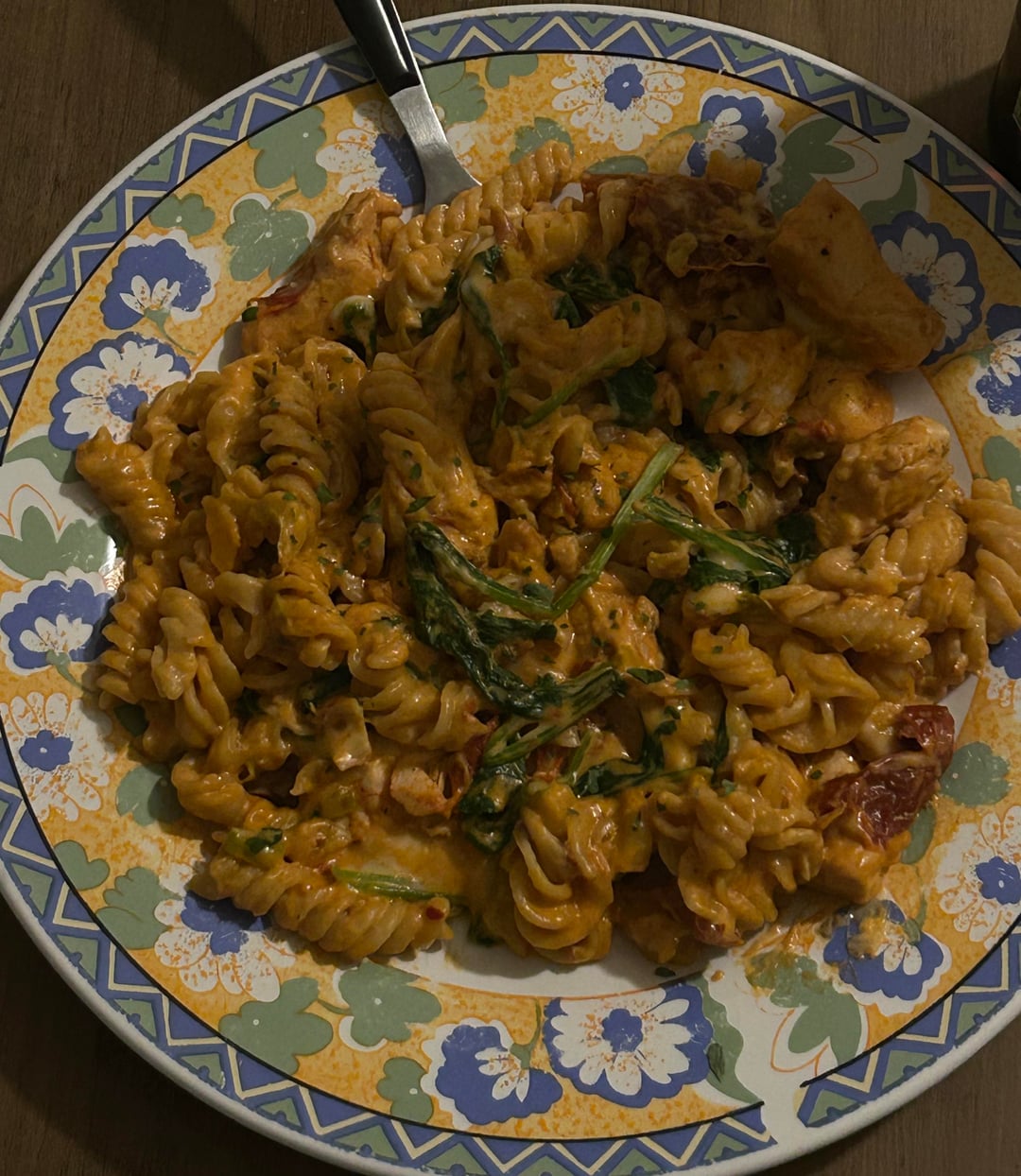 80g wholewheat pasta, 150g chicken (salt, pepper, paprika, chili flakes, garlic), spring onion, sundried tomato, tomato puree, single cream, spinach, mozzerella cheese and parsley. around 50g protein 🙂by starimei Dining and Cooking