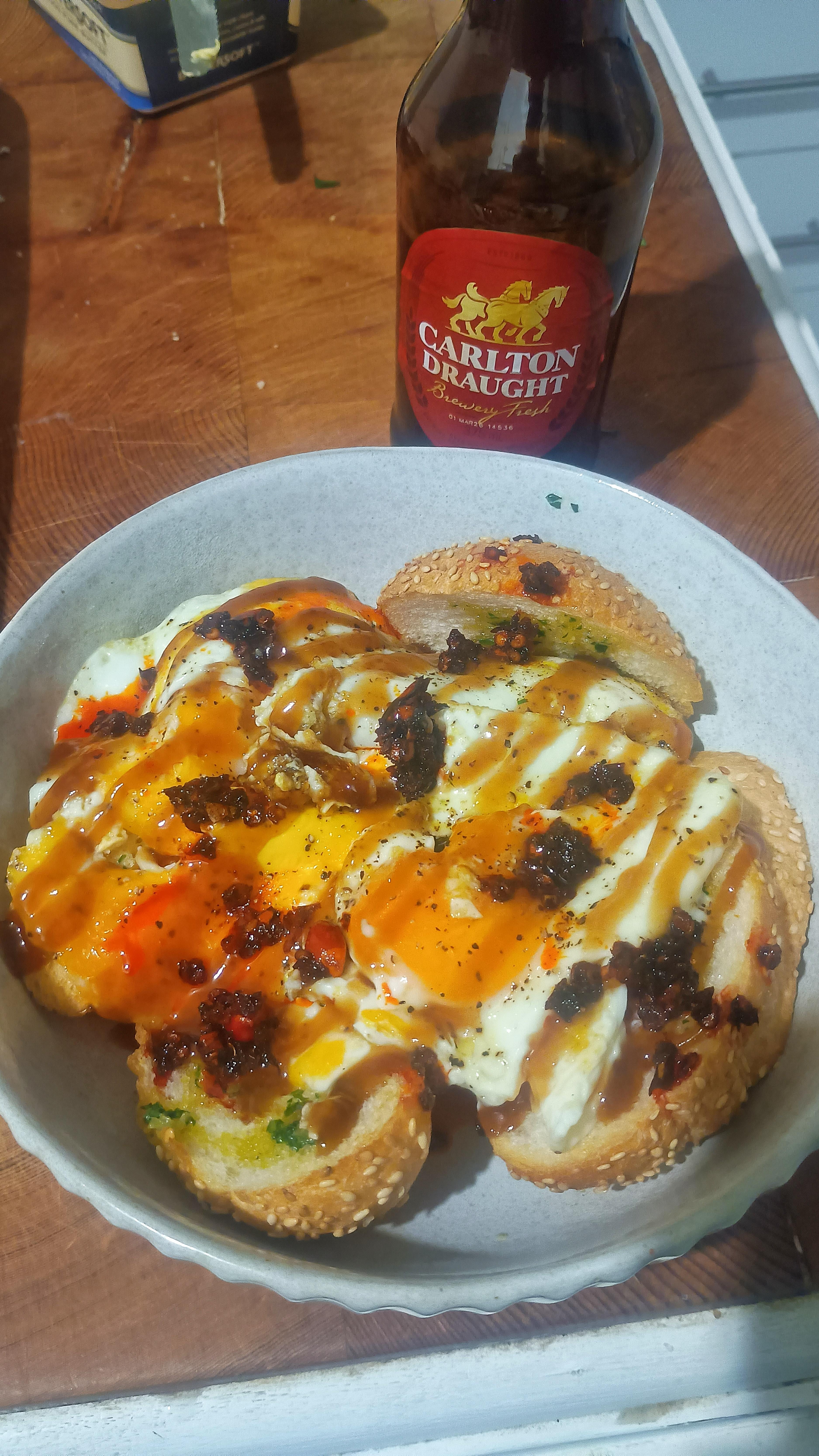 Garlic bread covered in fried eggs with hoi sin and chilli oil and a side of Carlton Draughtby rollyroundround 12 Comments friend_unfriend 1 month ago Delicious ! Queenfootsey 1 month ago Well imo it doesn’t look bad! Happy_Examination_35 1 month ago I disagree. That looks pretty good to me. sometimesafungi 1 month ago this looks fkn delicious op BeerAndWings4 1 month ago Love this type of meal senbenitoo 1 month ago Bet it tastes like awesome, and being drunk, there will be that many more of them in your vision… Mike-the-gay 1 month ago It looks fucking delicious and I’m sober! Well not drunk at least. supperfash 1 month ago You could raise one end of the plate so it hides the shit beer so it would look more appealing. AllOfTheSoundAndFury 1 month ago Looks fucking great Remarkable-Shock8017 1 month ago But it does 😋 kipwrecked 4 weeks ago You had me til Carlton Draught Own_Contribution1866 4 weeks ago Looks fire to me