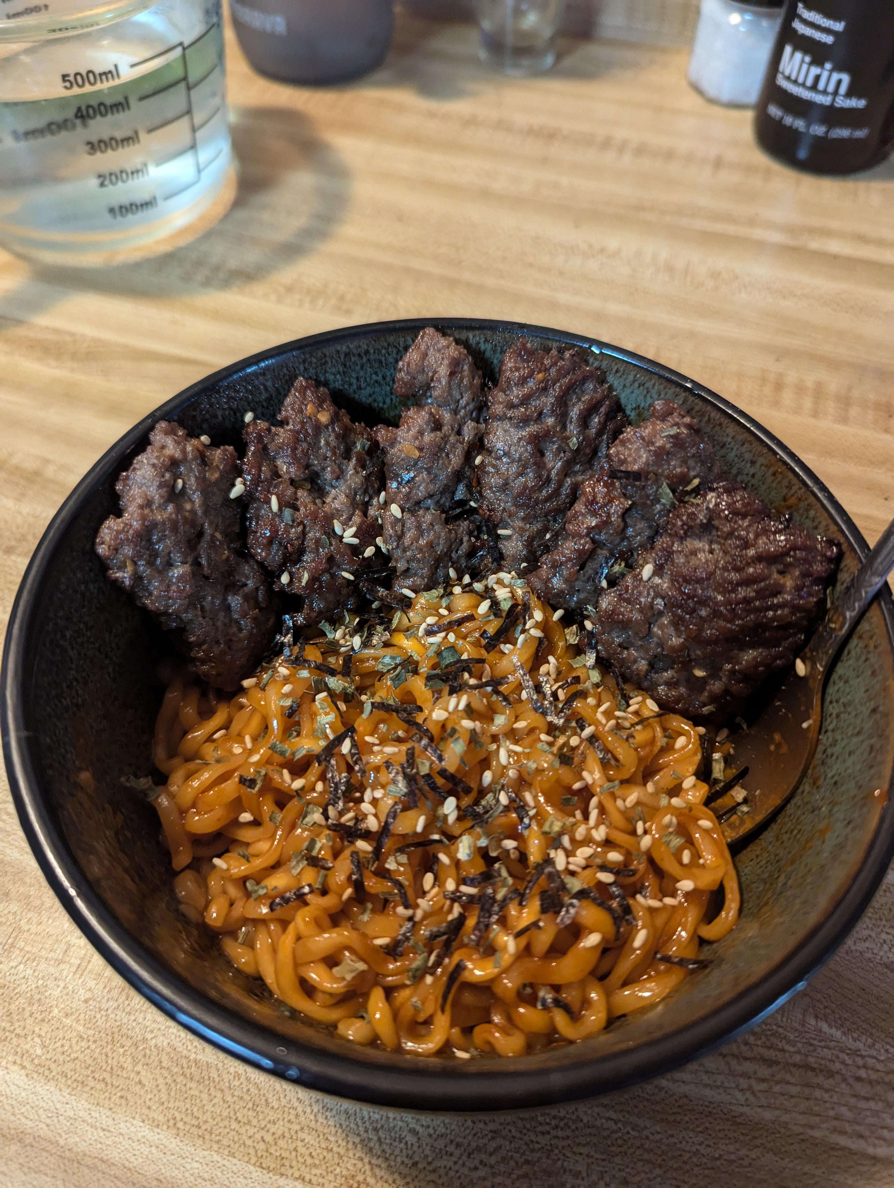 I had little more than spices, a protein, and the black spicy buld@ck ramen pack. Sadly nothing fresh and colorful. Spur of the moment.