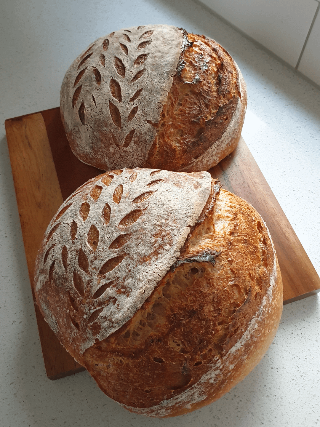 Roughly halved the dough into 2, pre-shaped then rested on the bench for 20mins before final shaping. Put in bowls lined with a tea towel and covered with plastic shower cap.