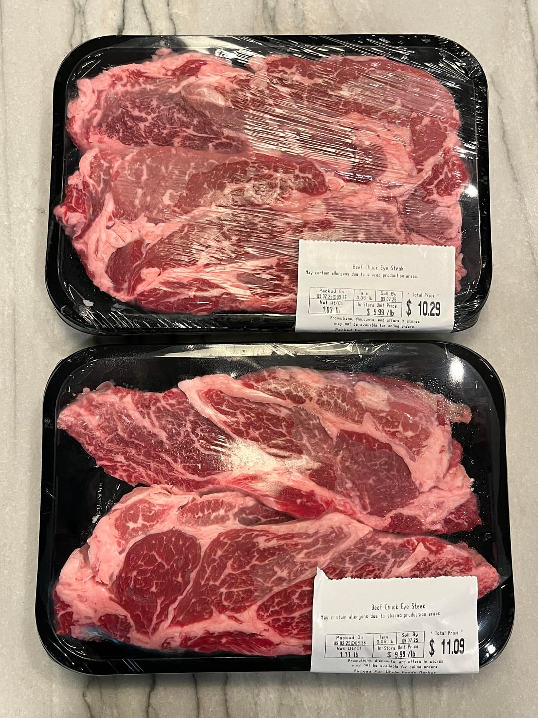 Found these Chuck Eye steaks for $9.99/lb at Whole Foods. I thought it was a good looking cut and decent price to work on achieving a perfect Medium Rare.