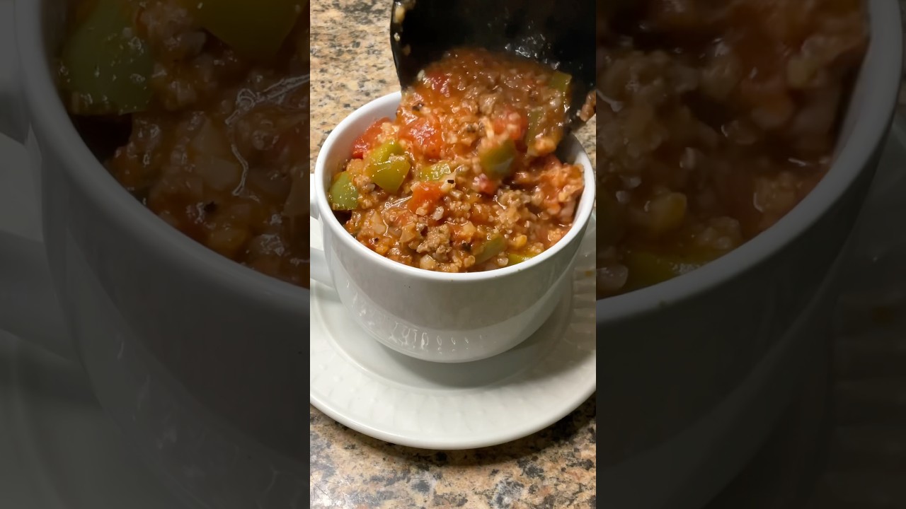 this stuffed pepper soup is so hearty so filling and so delicious that you’ll have a hard time believing that it’s good for you to make it brown a pound of Italian sausage and a pound of ground beef add a diced onion 5 to six chopped green bell peppers six to seven minced garlic cloves and these seasonings that I’ll have listed in the recipe at the end of the video give that a quick mix then add a teaspoon of beef bullion and a cup of water add a 28 Oz can of crushed tomatoes and two cans of fire roasted diced tomatoes give that a quick stir then add in 2 12 oz packages of Frozen rice cauliflower that’s been cooked and drained the directions for using regular rice can be found on my website but I highly recommend the cauliflower rice once you have that mixed together you’re going to let it simmer for about 45 minutes to an hour when it’s finished season to taste if needed and that is all there is to it a healthy decadent soup that you can enjoy again and again now pause the video to screenshot the recipe enjoy
