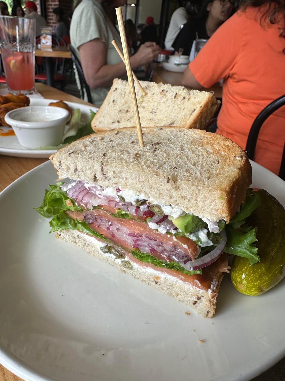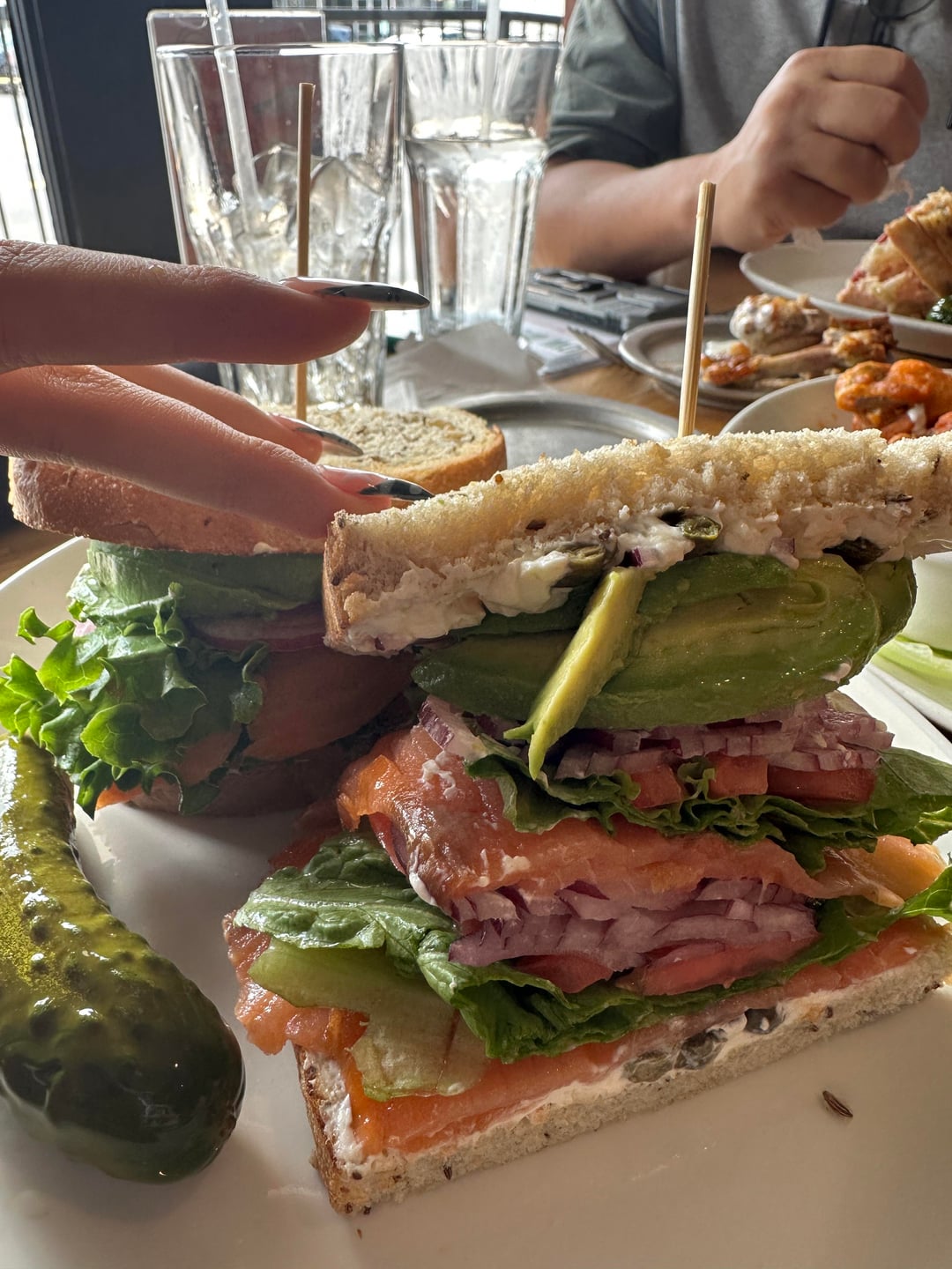 Calories in this huge smoked salmon sandwich? by No_Job_1383 2 Comments saknaa 2 months ago 600-700? No_Plantain_2062 2 months ago The bread looks thin which is good. Questions: Is the white substance cream cheese? Or mayo? Or Cottage cheese? Is it a full avocado or half of one?Here is my estimate2 large slices of bread (thin cut) – 160 cals 2 oz smoked salmon – 66 cals 1/2 California Avocado – 114 cals 2 slices of onion – 11 cals 2 leafs romaine – 10 cals 2 tblsp cream cheese – 102 calsTotal = 462 calslink for reference/adjustment [https://tools.myfooddata.com/recipe-nutrition-calculator/173418-169247-170000-171706-173687-174924/wt1-wt3-wt7-wt2-wt1-wt5/2-2-2-0.5-2-2/1](https://tools.myfooddata.com/recipe-nutrition-calculator/173418-169247-170000-171706-173687-174924/wt1-wt3-wt7-wt2-wt1-wt5/2-2-2-0.5-2-2/1)
