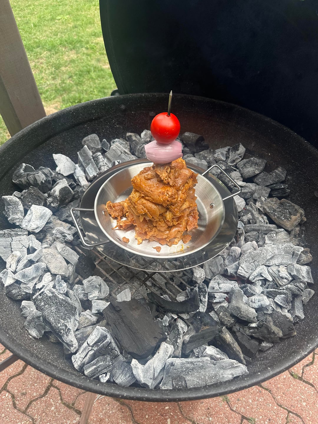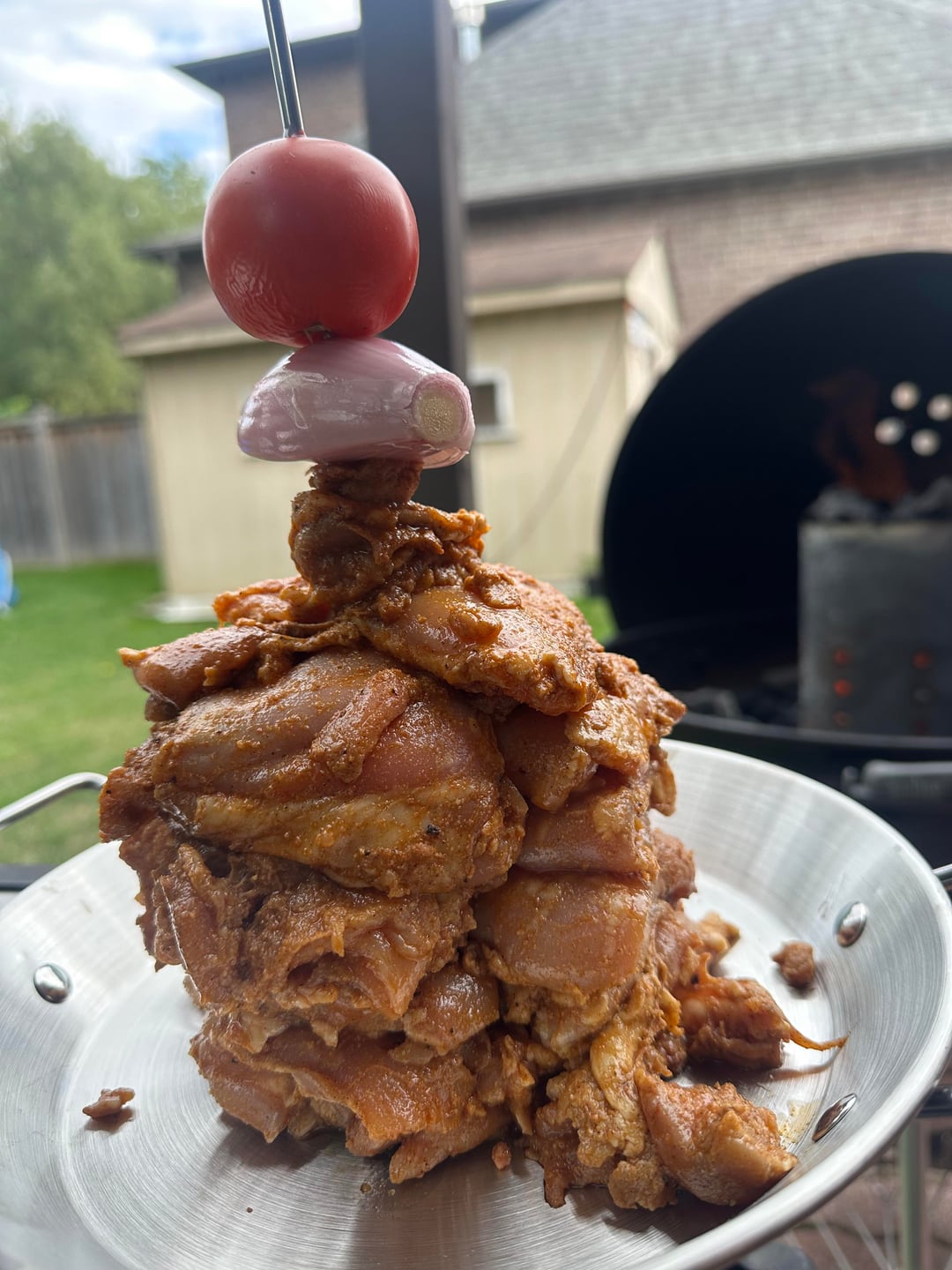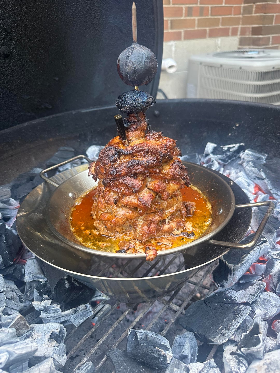 If you have a flat top it’s also great because you can throw lamb fat on their and cook the chicken in the lamb fat. Alternatively if you’re going vertical you can also put lamb fat on the top and it’ll drip down. The rotating vertical grills are also really good and very inexpensive. They also do the joetissery which lifts the large egg and I’ve had great results with that as well, but you need to go horizontal. So many different ways of doing it