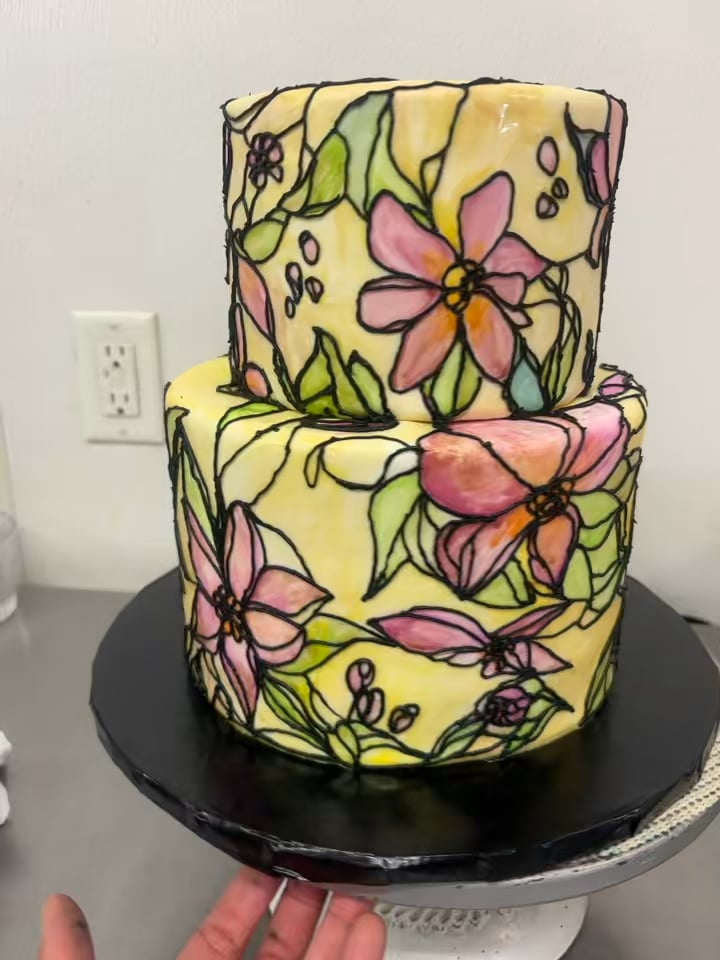 Was a bit rushed to meet the deadline, but loved the technique and process. Next time I want to take extra time painting the fondant and trying different imagery. I think next time I will steam the cake before adding the buttercream lines so it has more of a glass like look to it.