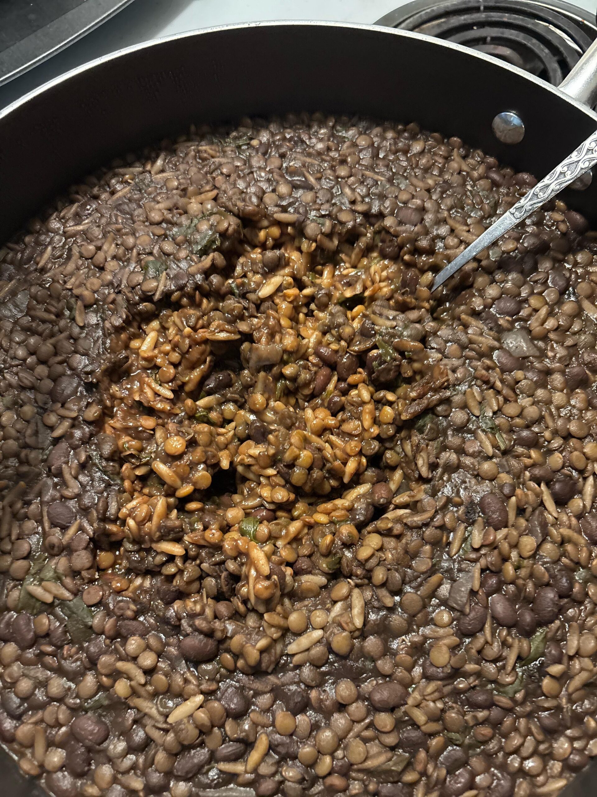 Just a hint that works for me is to cook starches like pasta, rice, farro orzo etc, separately from the stir fry, curls, beans so you can control water, heat and timing and get both perfect. Add together later. You can still add bay leaf or Better Than to the starches so they have their own flavor. That being said, I’d definitely dig into this dish!