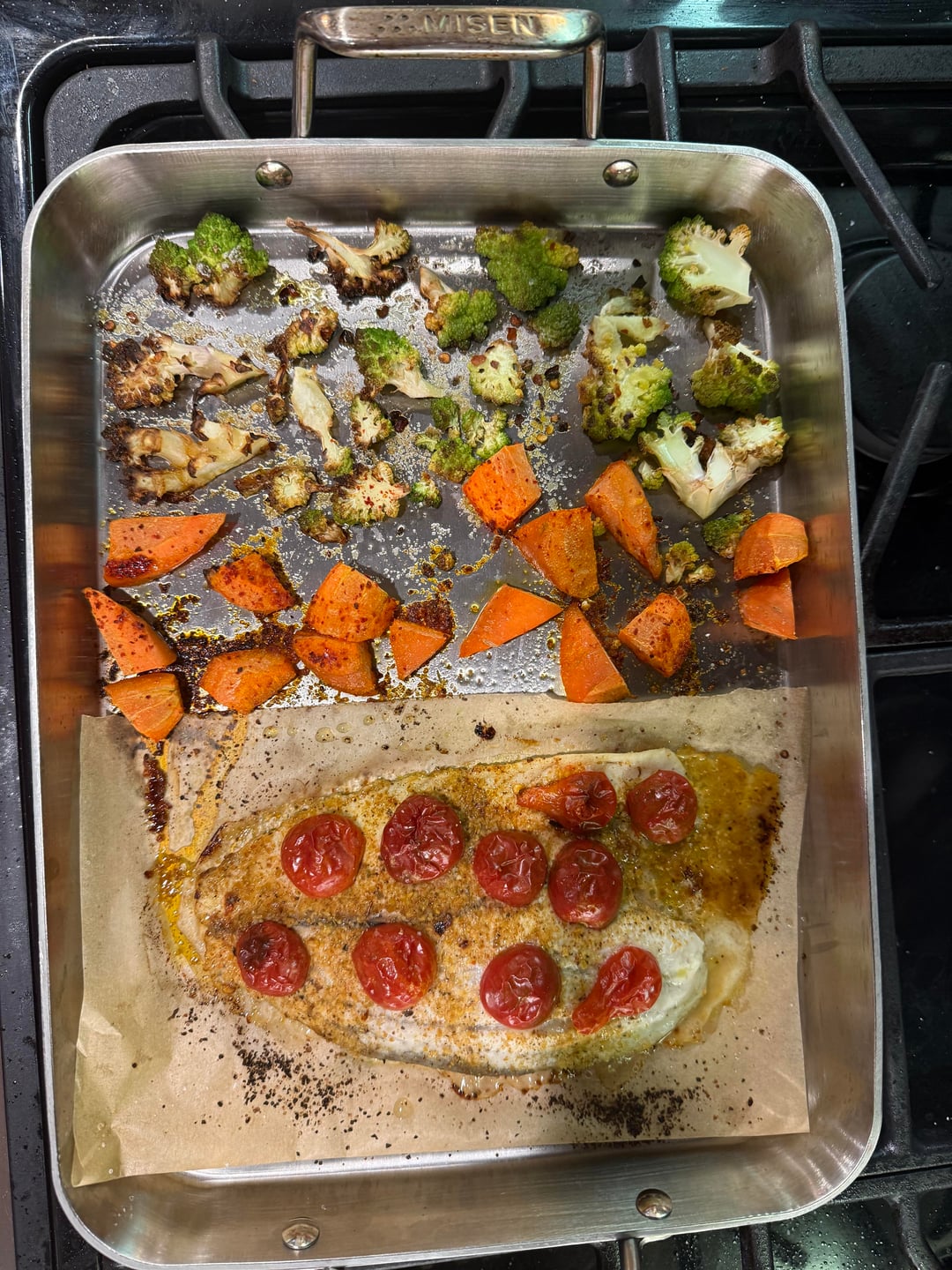 the veggies were seasoned with chili flakes, salt, onion powder. The fish got a cuban mojo spice blend and cayenne. Everything got a drizzle of olive oil. 17 minutes at 375.Leftover quinoa. by PlantedinCA 1 Comment Normal_Acadia1822 1 month ago I love a good sheet pan dinner!