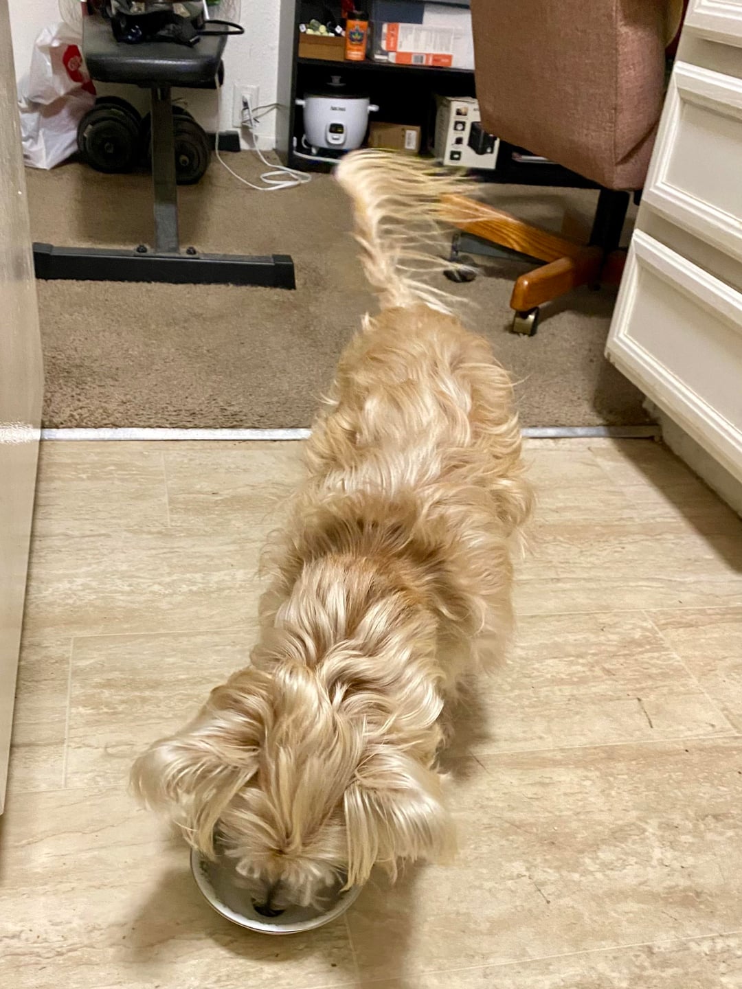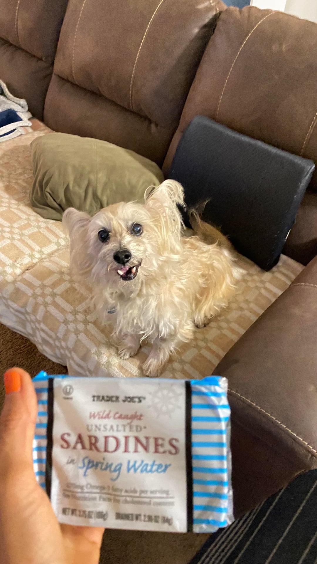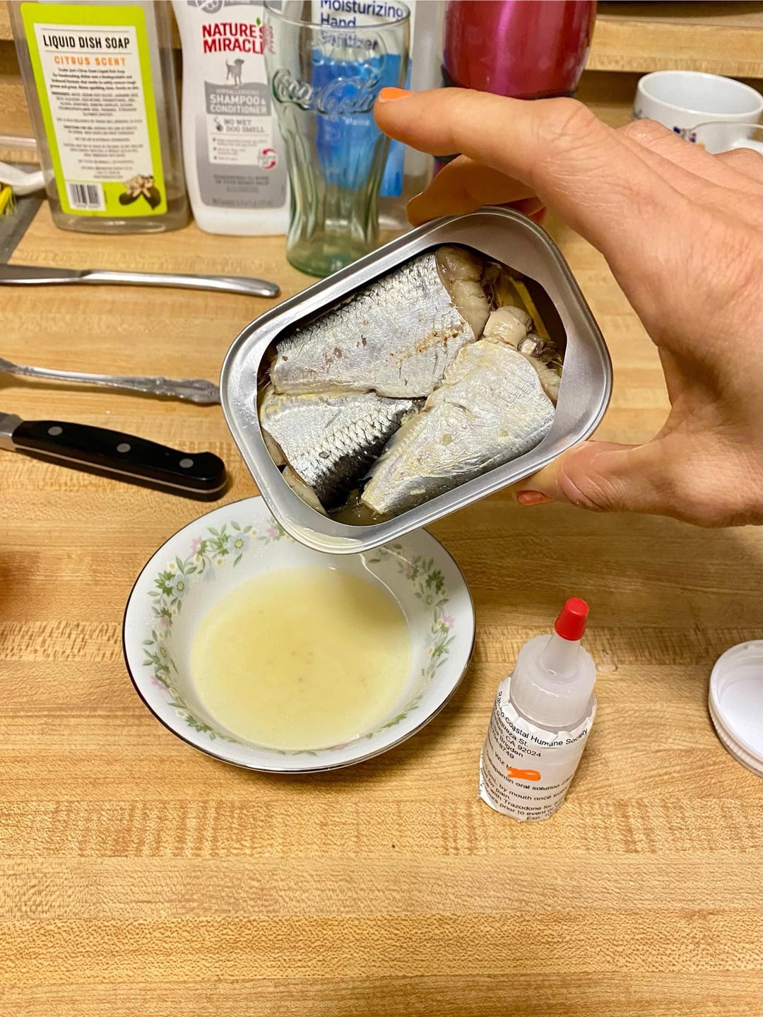 My Dad’s senior dog had some teeth pulled yesterday, so what better way to give him his meds than in the water I always let him have when I’m done with my sardines? He goes apeshit whenever he sees a tin. A gentleman of good taste.