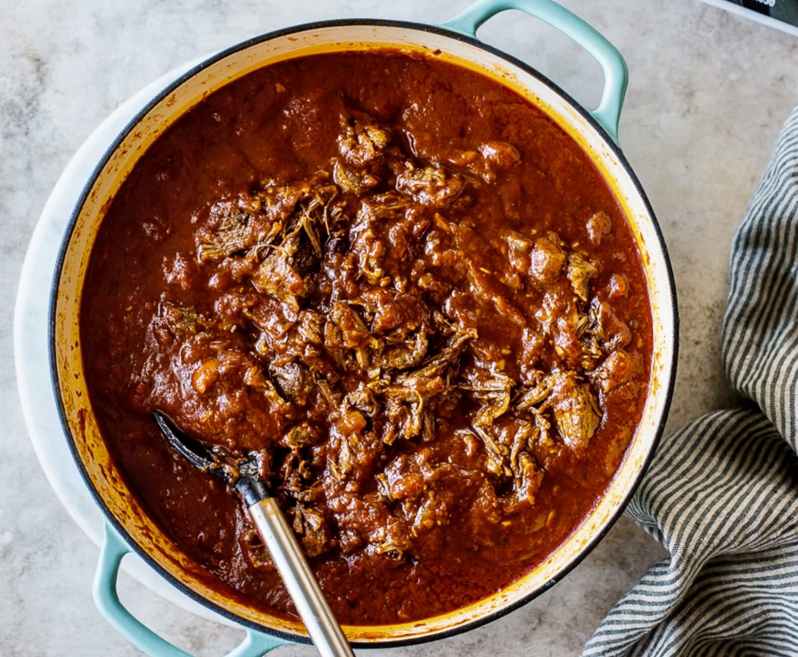Heat a large Dutch oven over medium-high heat for 4-5 minutes. Pat the short ribs with paper towels. Season ribs generously with kosher salt. Pour the avocado oil into the hot Dutch oven. Heat the oil until it shimmers. Add the short ribs and cook until they’re browned, about 3-4 minutes on each side. Remove to a plate. Reduce the heat to medium and add the celery, carrots and onion. Season with a bit of salt. Cook, scraping up the brown bits from the bottom of the pot, until the veggies are softened, about 10-12 minutes. Stir in the garlic and cook for an additional minute. Return the meat to the pot with any juices. Add the tomato puree, thyme and bay leaves. Season with 1/2 teaspoon of salt and pepper. Stir and bring to a simmer. Reduce the heat to low, cover and cook until the meat is fork tender, about 2 1/2-3 hours. Transfer the meat to a large bowl and shred with two forks. Discard the bones, thyme springs and bay leaves. Return the shredded meat to the pot and stir in the torn basil leaves. Adjust the seasoning if desired. Serve immediately.