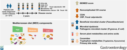 Adherence to the MD was associated with lower FC levels at baseline and after 3 months. Future studies should examine the long-term effects of MD adherence on the maintenance of clinical and biochemical remission in CD.