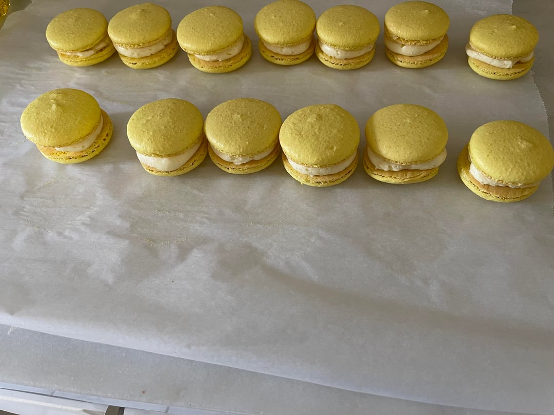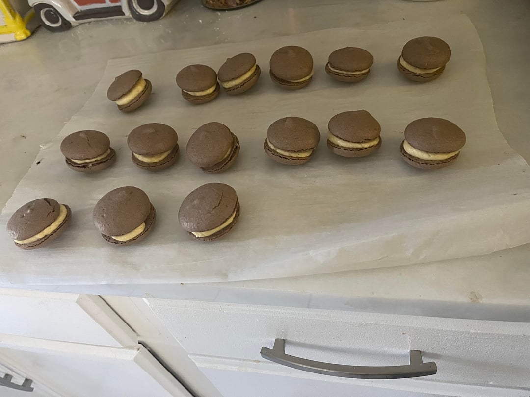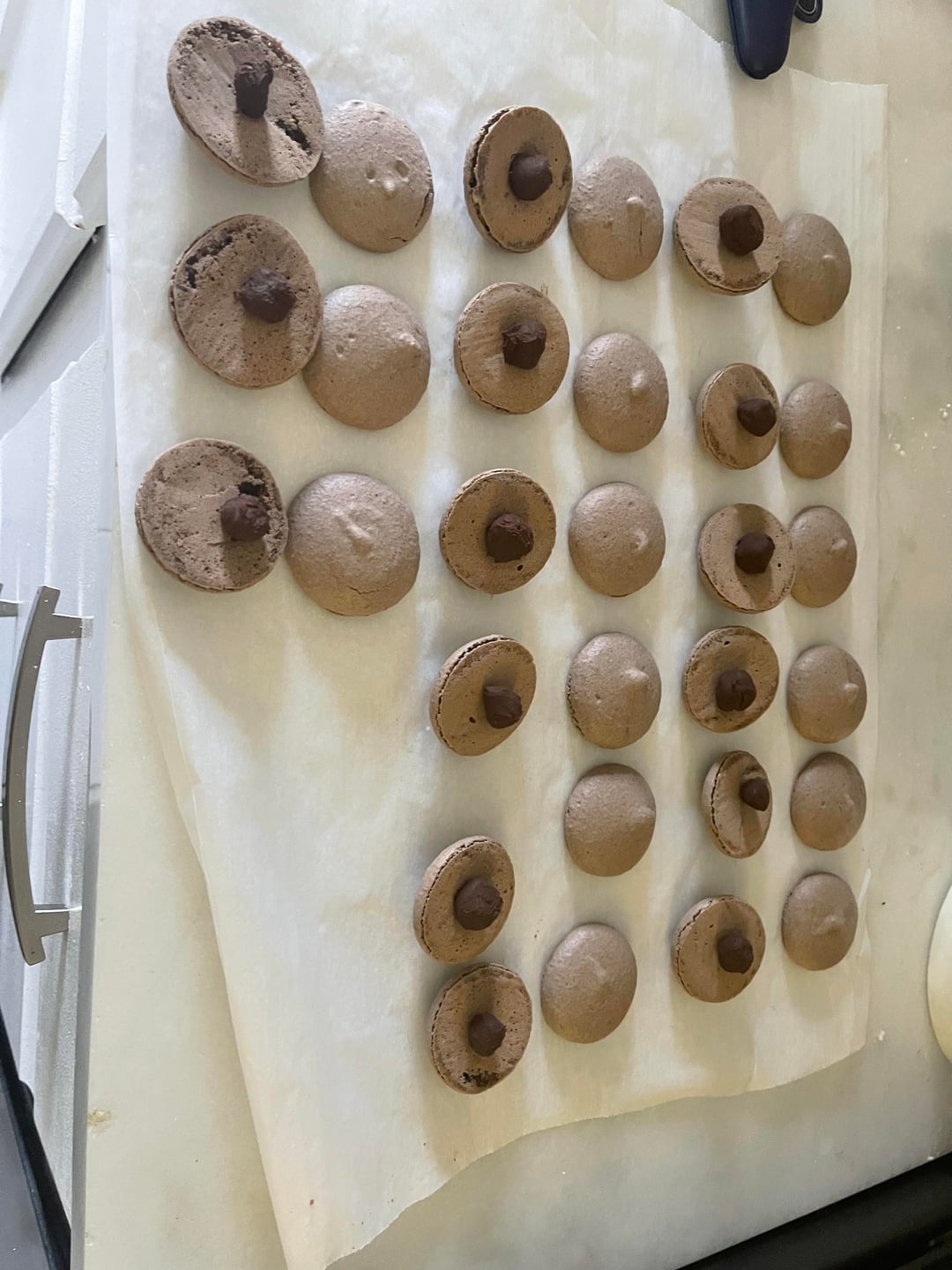 I made lemon with lemon buttercream and lemon curd and chocolate with hazelnut buttercream and chocolate ganache. Added 1 tablespoon of black cocoa to my dry ingredients and my meringue hated it! Barely any macronage! Did not have nice flat tops on the chocolate but will keep trying. French method on both