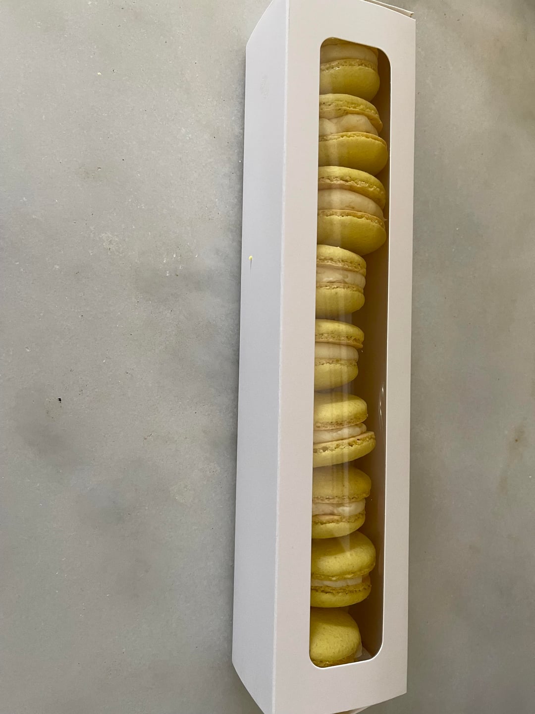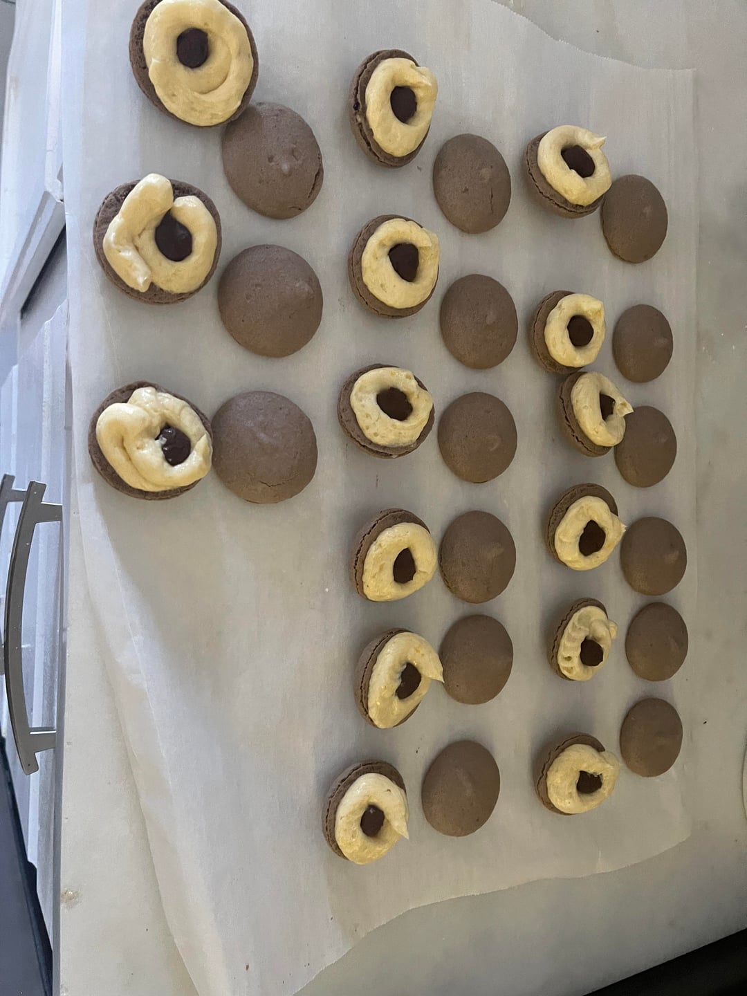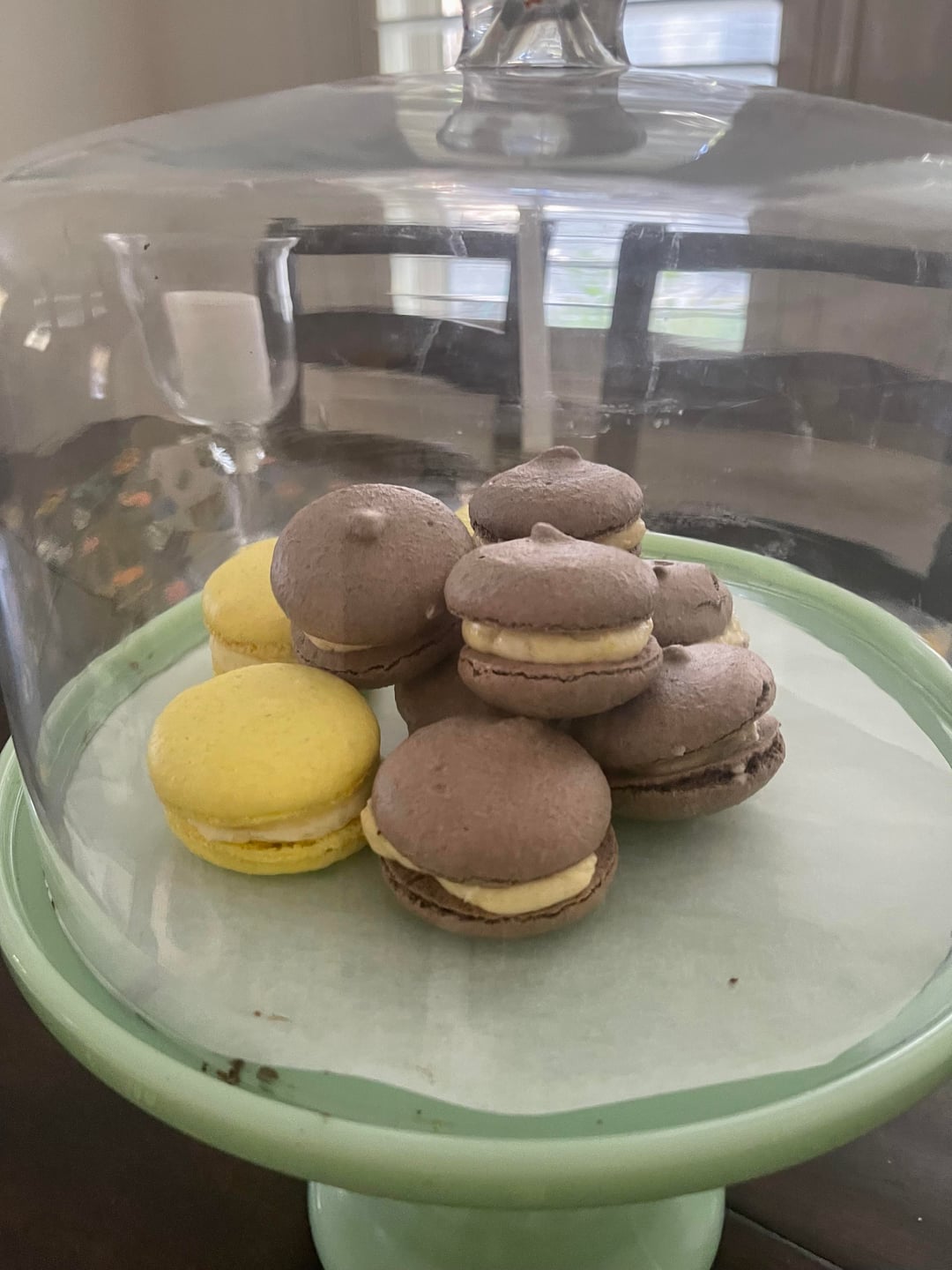 I made lemon with lemon buttercream and lemon curd and chocolate with hazelnut buttercream and chocolate ganache. Added 1 tablespoon of black cocoa to my dry ingredients and my meringue hated it! Barely any macronage! Did not have nice flat tops on the chocolate but will keep trying. French method on both